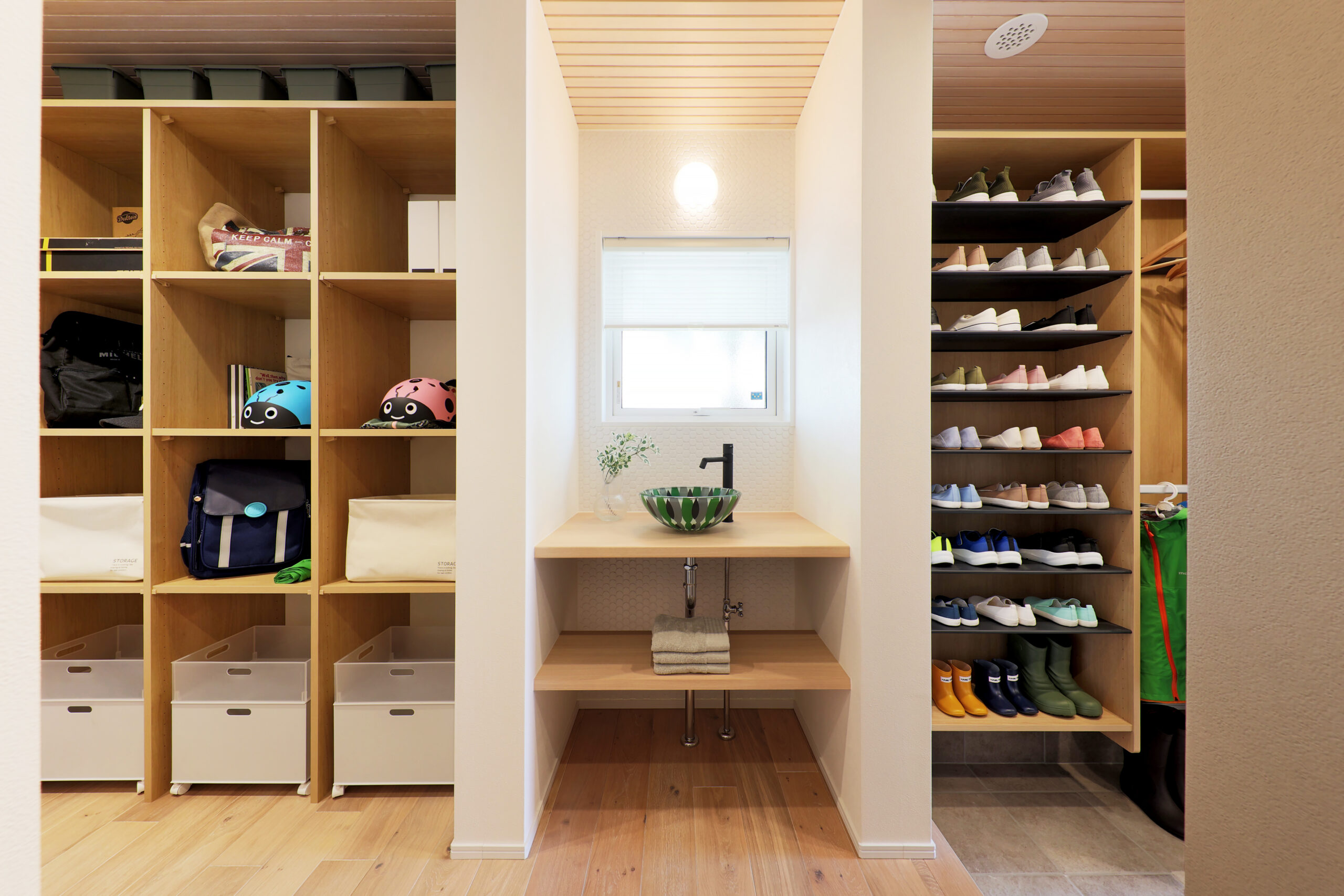 バーンドアの内側は大容量のシューズインクローゼット。靴を脱いで直ぐ、強化ガラス製ボウルの手洗いカウンターがあり、ただいまロッカー兼リビング収納へと続きます。