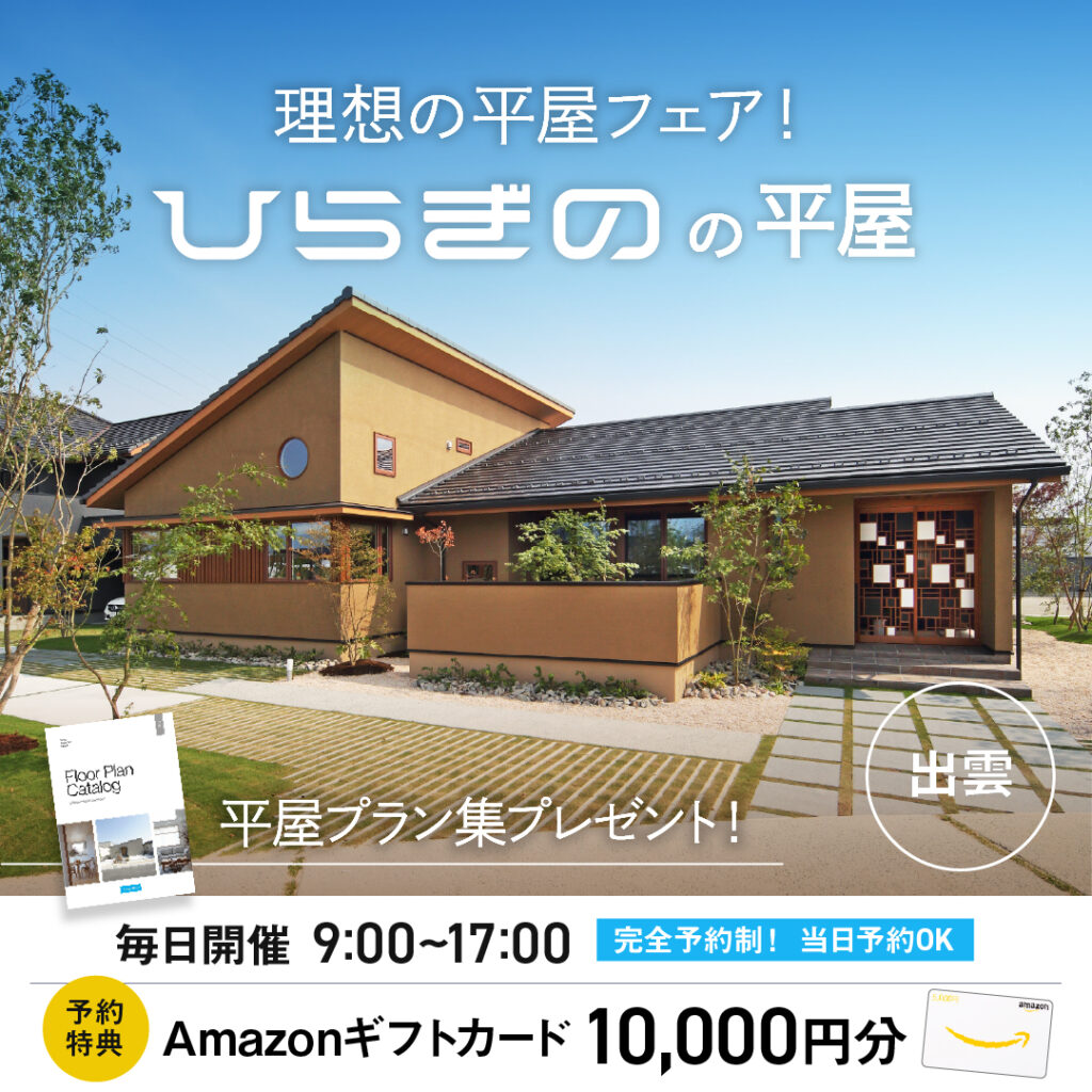 毎日開催中!「やっぱり、平屋が好き!」そんなあなたのための限定フェア! ※当日予約はお電話にてお問い合わせをお願いします。出雲支店【0853-22-2923】↑タップでかかります。※当日のご予約は時間によってはご希望に添えない場合がございます。 建てるなら、やっぱり“平屋”が気になる!そんな声にお応えして、3月限定!毎日開催の「平屋フェア」 をひらぎの出雲ハウスギャラリ…