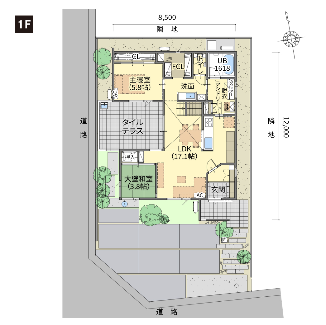 白の外壁とノルディックブラウンの葺き下ろした屋根が特徴的な平屋風2階建て住宅。プライバシーが守られた玄関とタイルテラス、1階で生活がほぼ完結する平屋のようなスムーズな生活動線が、今だけでなく将来もずっと暮らしやすい生活を約束してくれます。