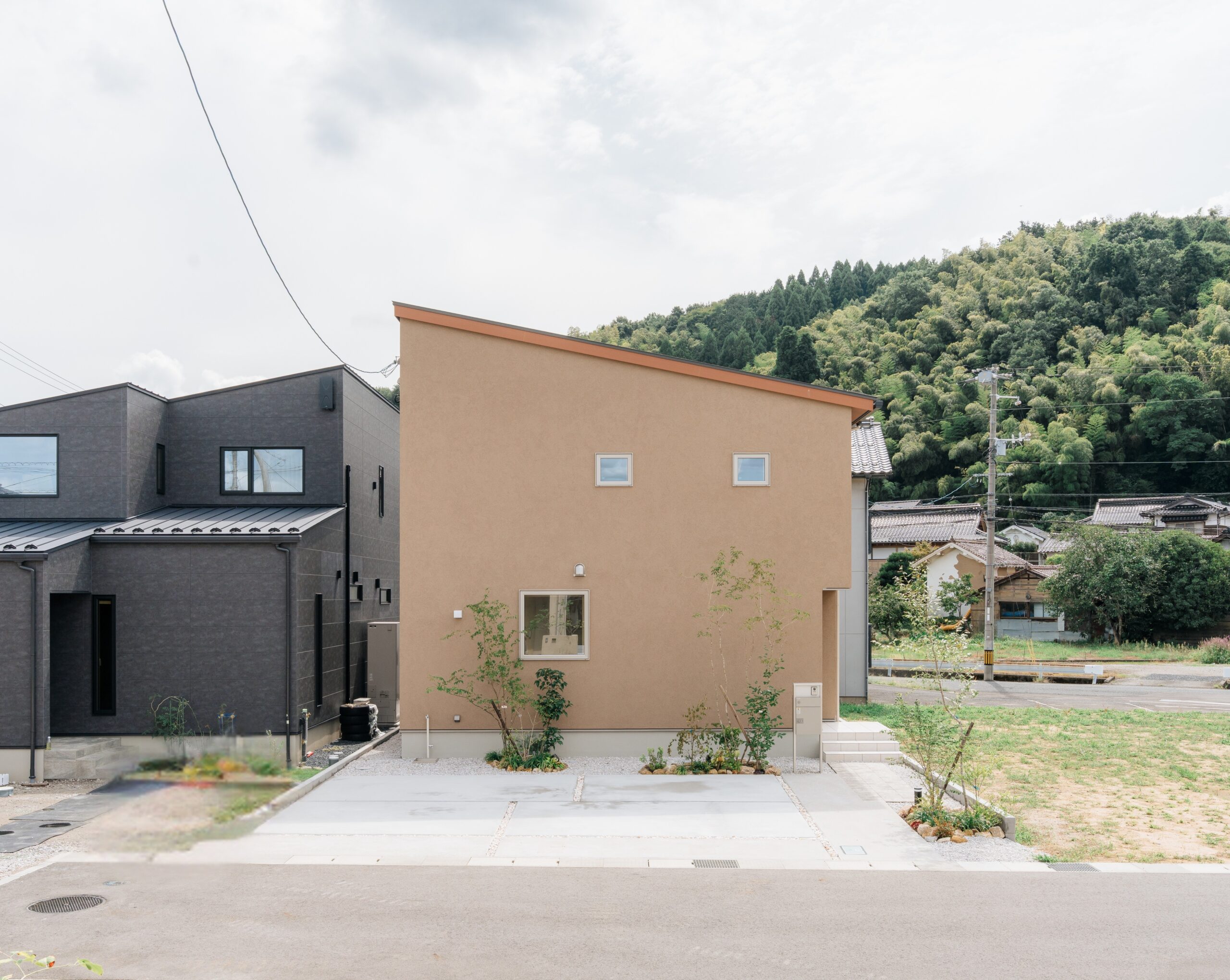 和モダンテイストの片流れ屋根が、シンプルながらも上質な印象を与える外観デザイン。北側のファサードには四角い窓がアクセントとなり、落ち着いた茶系のアースカラーが温かみを感じさせます。道路側から見える正面には、隅切りを施し、アプローチ動線が巧妙に隠れているため、玄関前はプライバシーを守りつつ開放感を感じさせるデザインに仕上げられています。周囲の環境と調和した植栽が、緑豊かな住宅の印象を作り出しています。