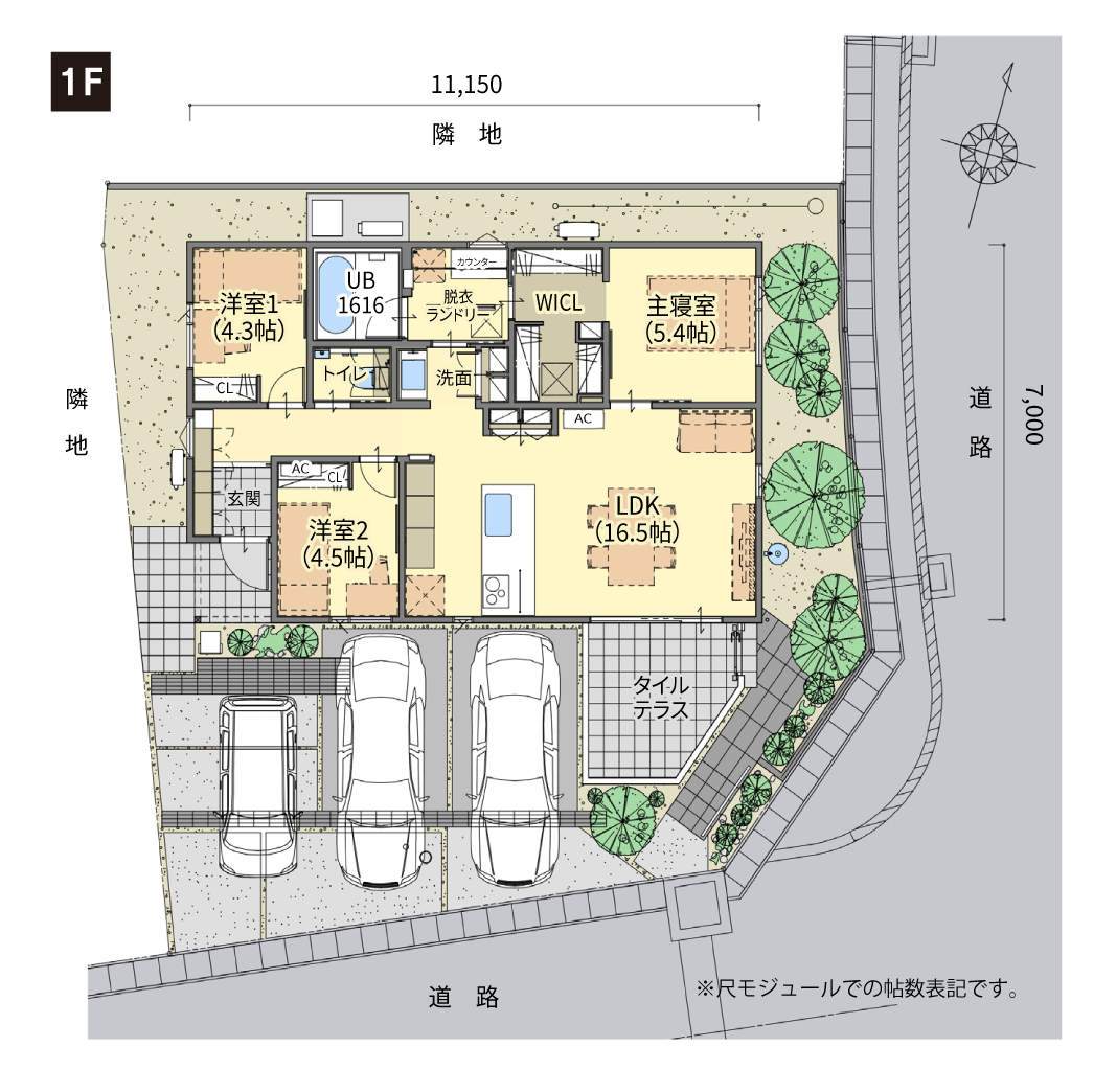 LDKは南面に位置しており、日当たりが良好で明るい空間が広がります。勾配天井によりさらに開放感が生まれ、ダイナミックな雰囲気を感じさせます。LDKから続くタイルテラスが、室内外の一体感を生み、豊かな生活空間に。また、テラスが壁で囲われているためプライバシーが守られ、外からの視線を気にせずリラックスできます。水廻りが一箇所に集約されており、キッチンと寝室から直結している2WAY動線で、機能性の高い間取りを実現。家事効率を高めるだけでなくお風呂から出た後、リビングを経由せずに直接寝室に行くことができ、生活の流れがより一層快適になります。