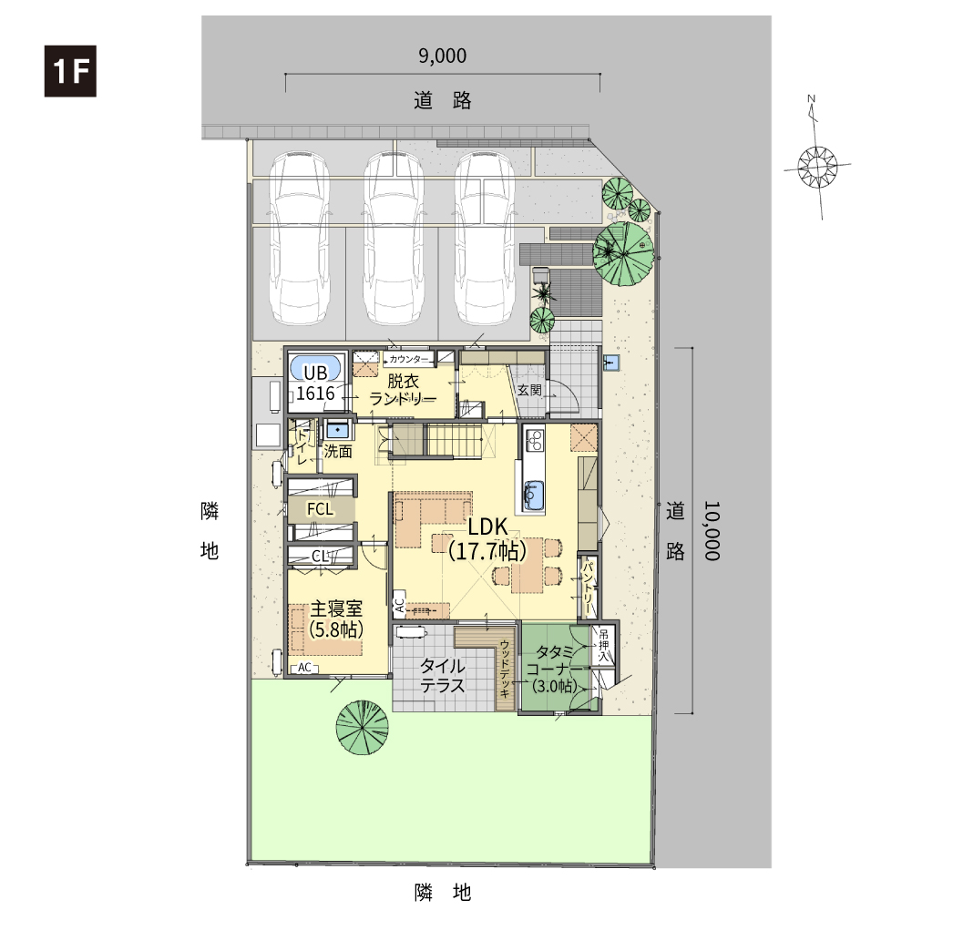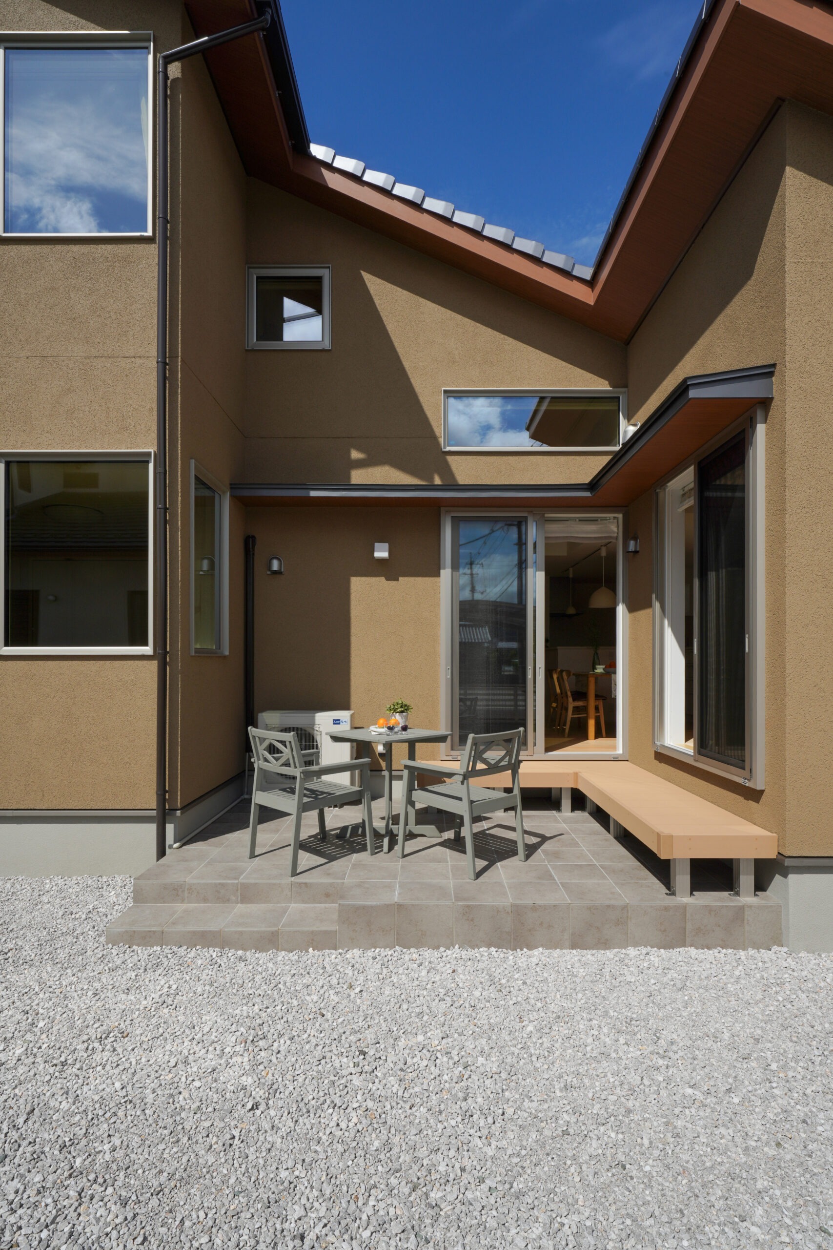 タイルテラスを道路から見えないよう内側に入れ込んだ造りにしたことで、プライバシーを確保。プライベート空間として、家族や友人とBBQや外でのランチなど、気兼ねなくお楽しみいただけます。