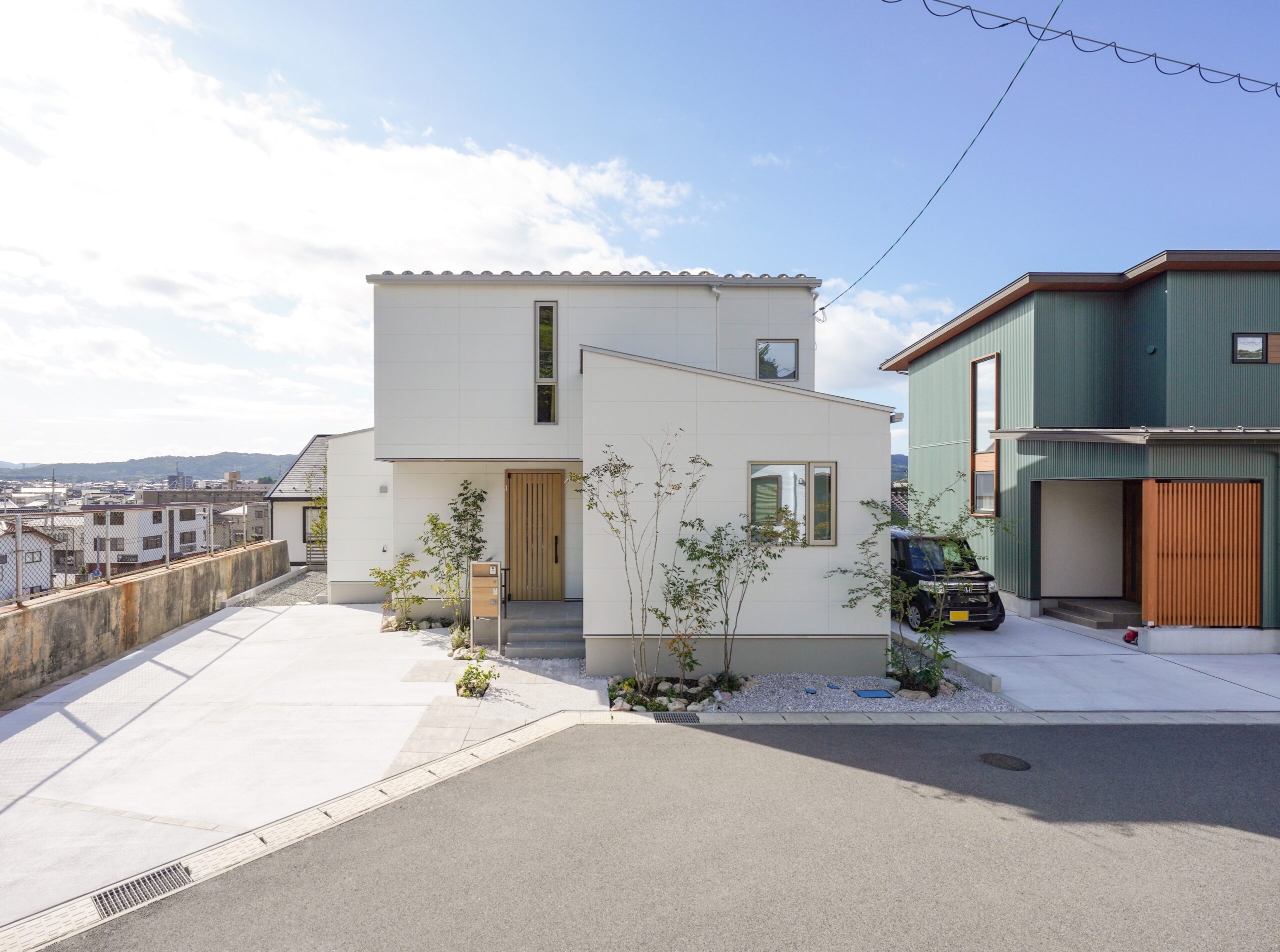 ライトグレーのやわらかな印象の外壁と、ブラックのサッシがアクセントとなり、洗練されたモダンな外観に仕上がりました。軒のないシャープなフォルムがスタイリッシュな印象を与えつつ、内装もグレーやライトグレーに統一し、外観との調和が美しい住まいです。玄関は道路に面しておらず、外からの視線を気にせずに過ごせるため、プライバシー面でも安心です。