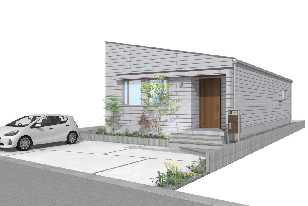 シルバーグレーの外壁に片流れのシルエットが映える、落ち着いた雰囲気の住まい。軒のないミニマルなフォルムが、すっきりとした印象をつくります。玄関には深みのあるブラウンのドアを採用し、穏やかに迎え入れる佇まいに。内観はホワイトを基調とした明るい空間で、随所に設けた豊富な収納が暮らしを整えてくれます。無駄をそぎ落としたデザインと機能性が心地よく調和する平屋です。