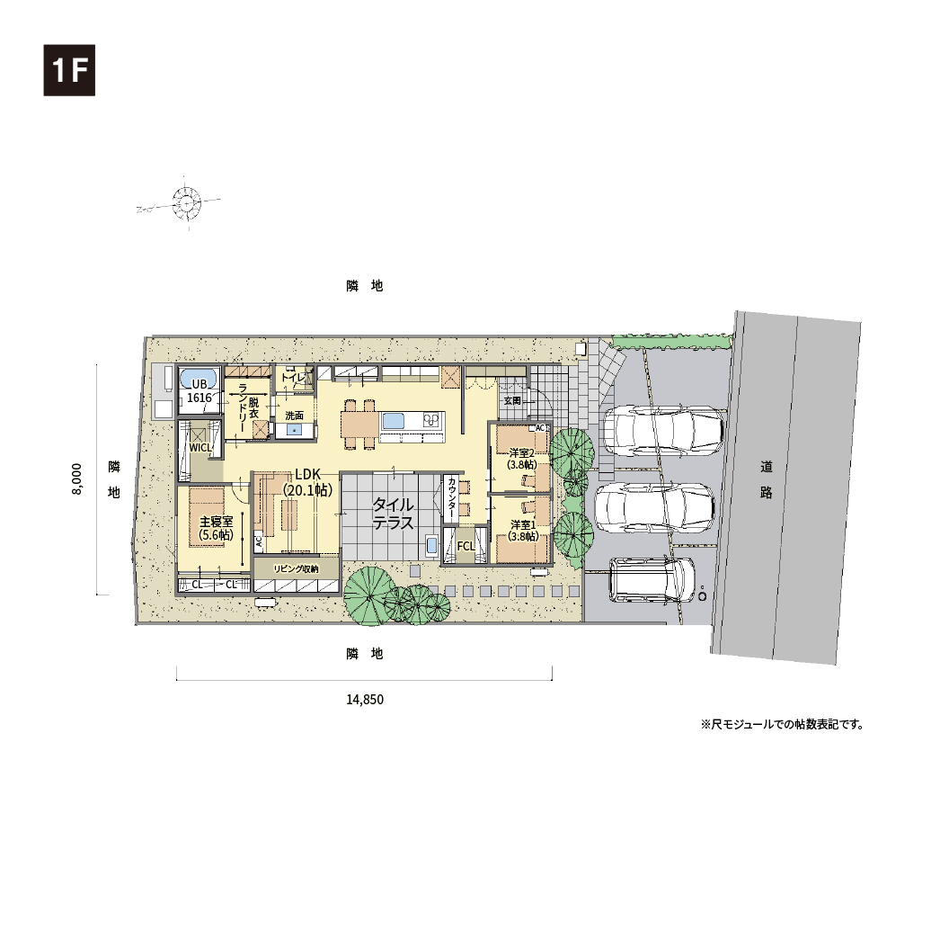テラスを中心に暮らしが広がる間取りが、住まいにゆったりとした余白をもたらします。外部からの視線を遮りつつ、光と風を取り込むテラスは、食事や語らいの時間を優雅に演出。リビング収納やWICLなど計画的に配置された収納が、日常を整え、空間の美しさを引き立てます。子供部屋の手前に配したスタディーコーナーは、落ち着いて学べる上質な居場所として、家族の成長をそっと支えます。