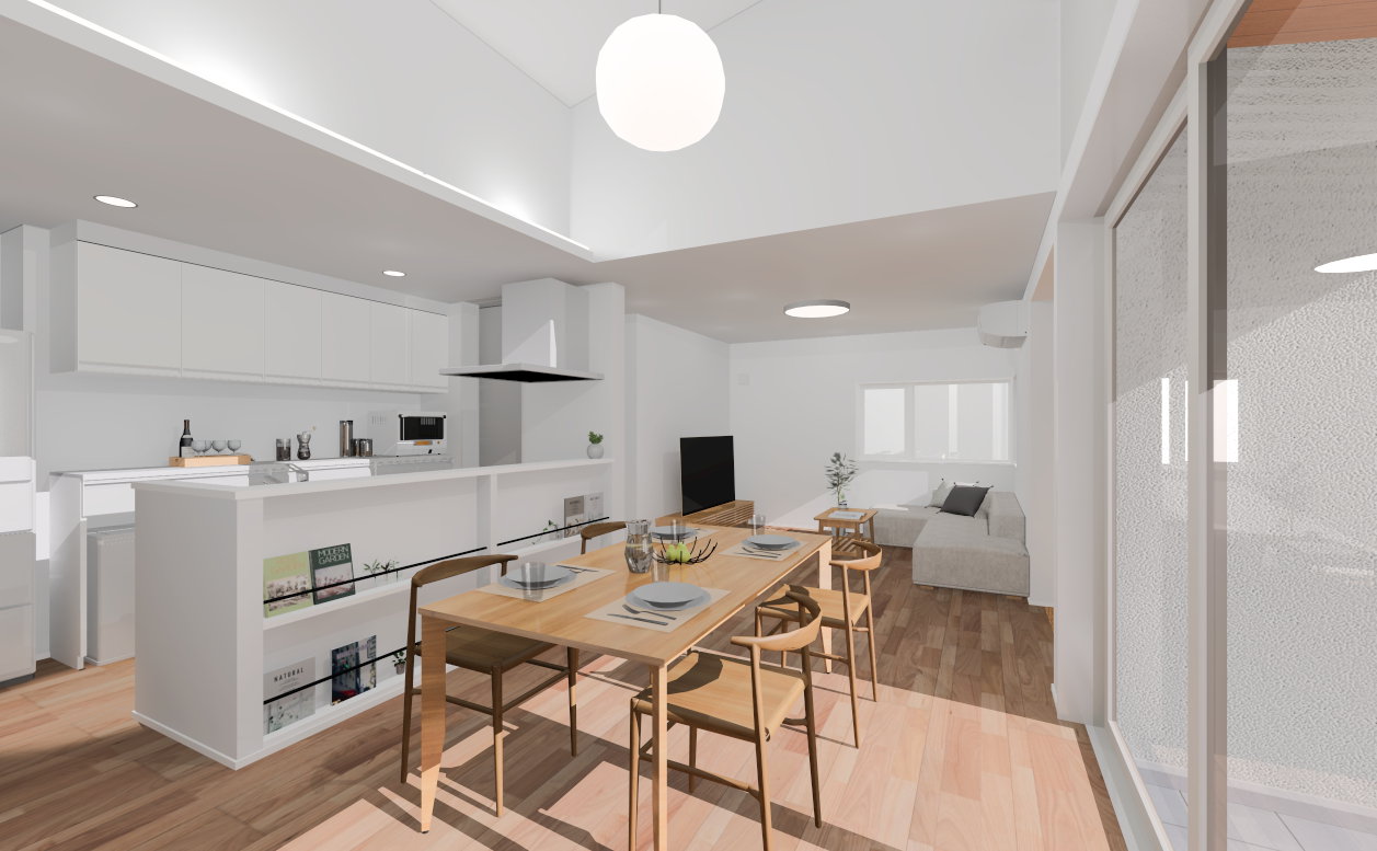 タイルテラスへと続く大きな窓が、室内と屋外をゆるやかにつなぎ、光や風を取り込みながら開放感のある空間を実現。家族がくつろぐリビングから気軽に外へとつながり、暮らしの楽しみを広げてくれます。
