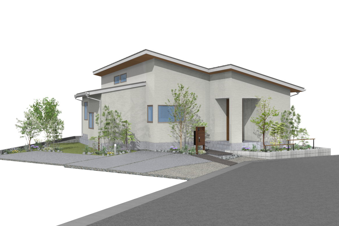 高低差のある屋根ラインと軒のあるデザインが、外観に奥行きと落ち着いた佇まいを演出します。