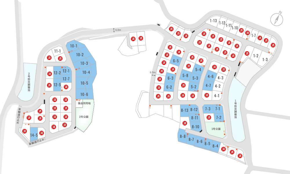 ※周辺環境の距離は現地北入り口からの移動距離を示したものです。地図上で算出しているため概算の数値です。実際とは異なる場合がありますので予めご了承ください。※10-4~10-6号地は土地の一部に水路と法面が、8-4、8-5、14-5号地には擁壁が含まれます。※5-8号地の土地価格には、土留めブロック工事代が含まれます。