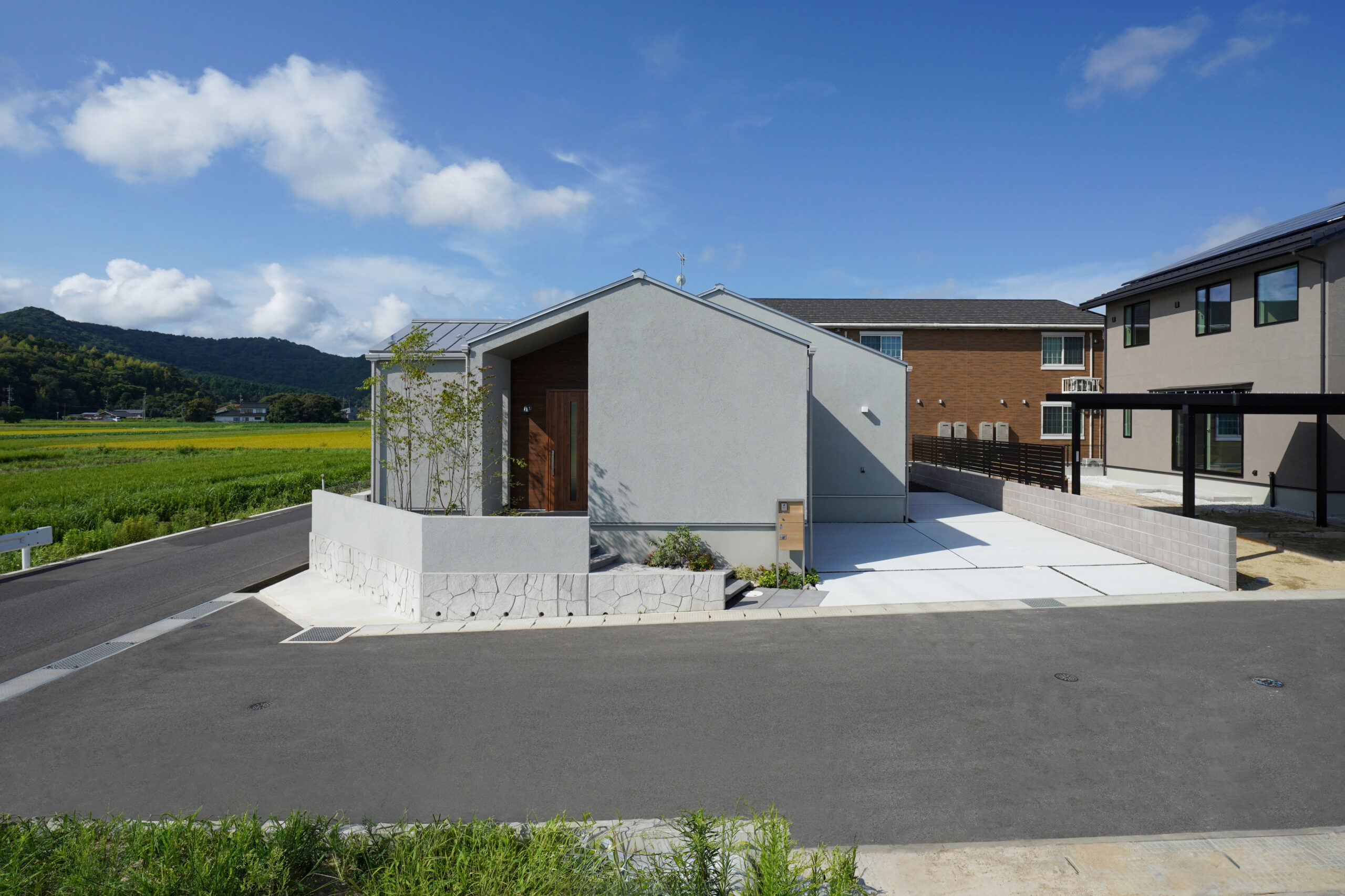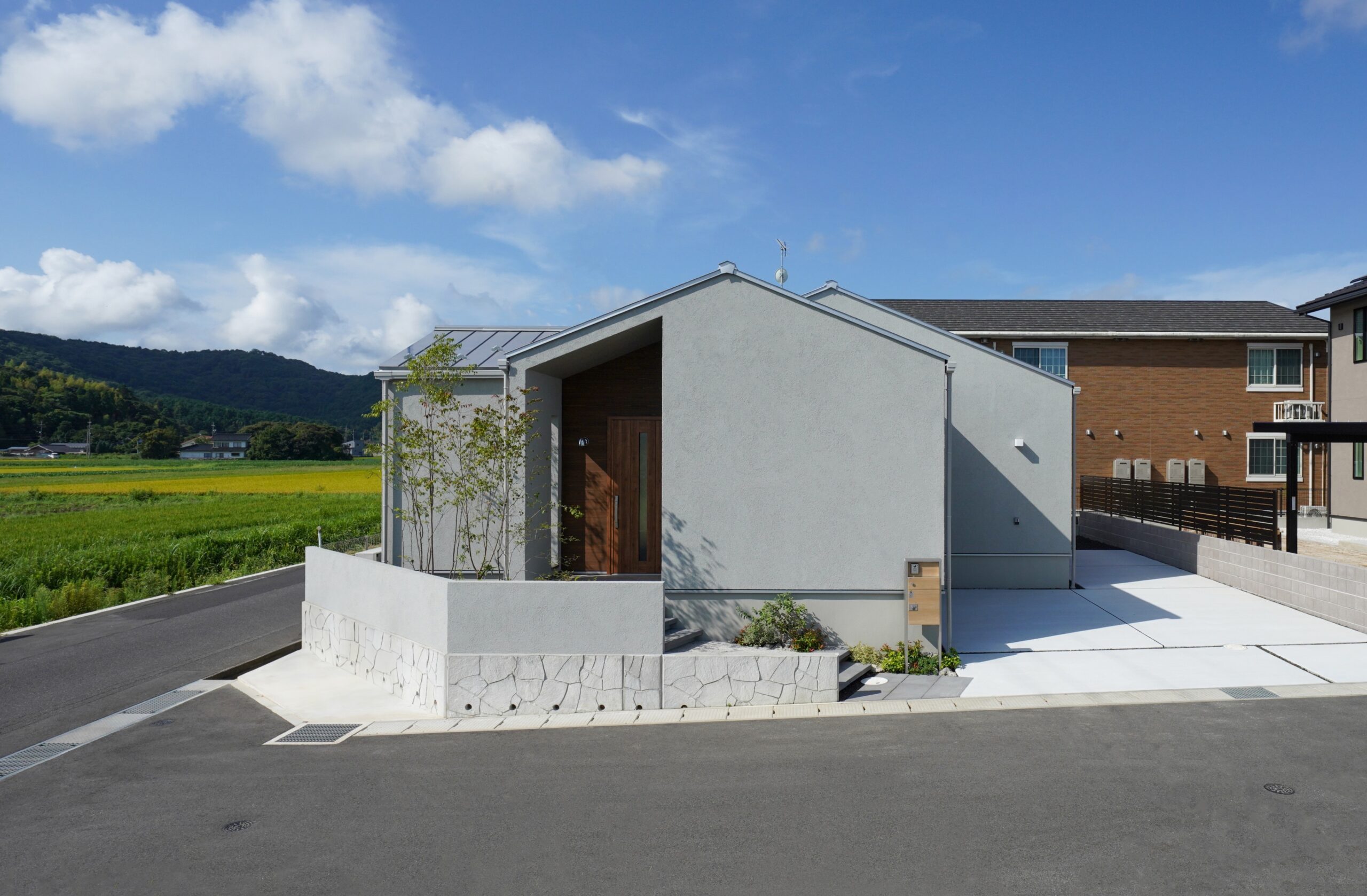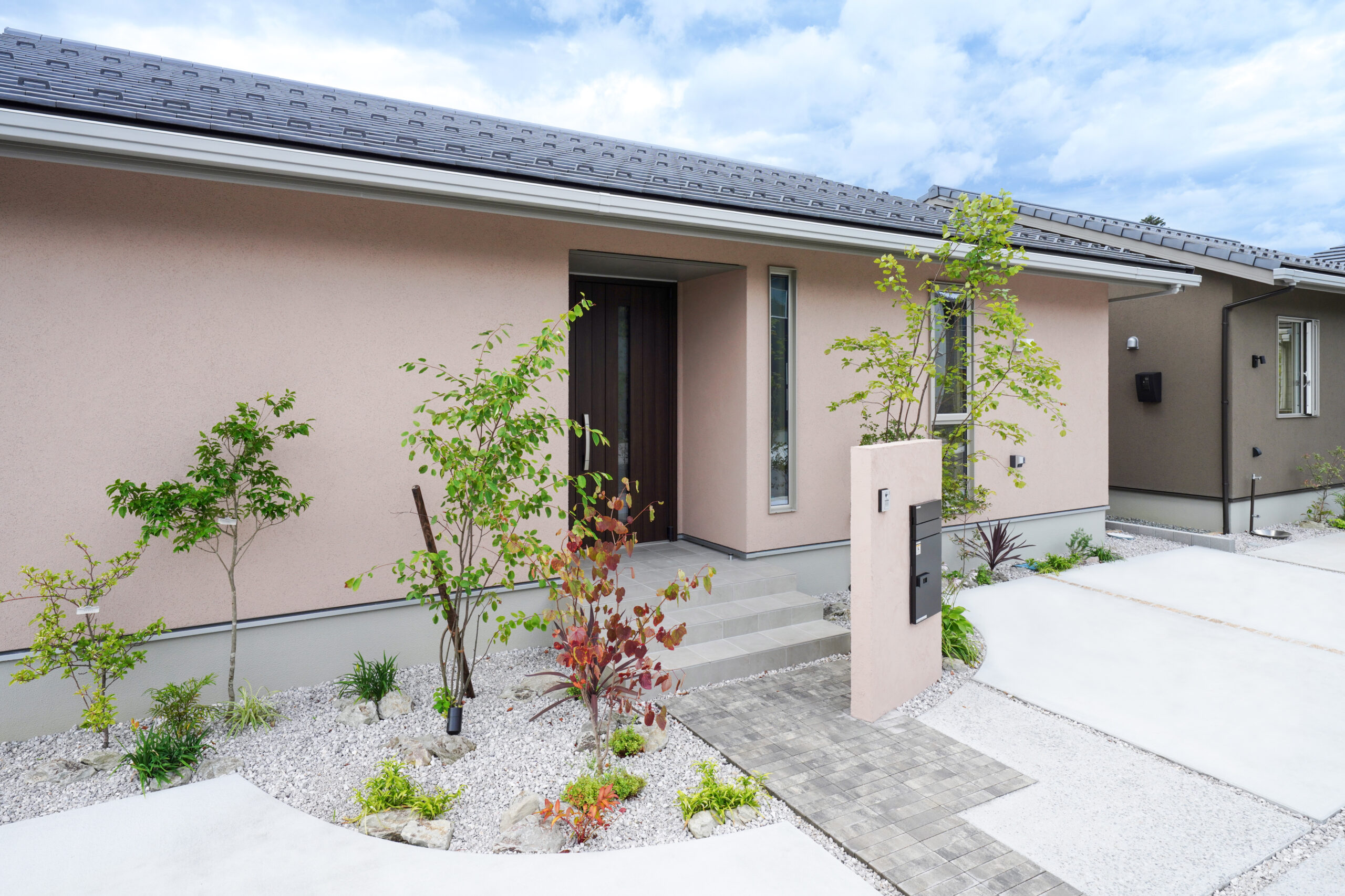 北入り口のシンプルで洗練されたファサードデザインが、落ち着いた品格を演出。玄関から家の中が見えにくい工夫で、プライバシーを確保しながらも開放感を感じさせる設計です。霞がかったグレイッシュな外壁と銀黒の屋根が織りなすミスティカラーは、自然の景色とも調和し、時を経ても美しさを保ちます。平屋ならではの安心感と、エレガントな外観が心を豊かにする住まいです。