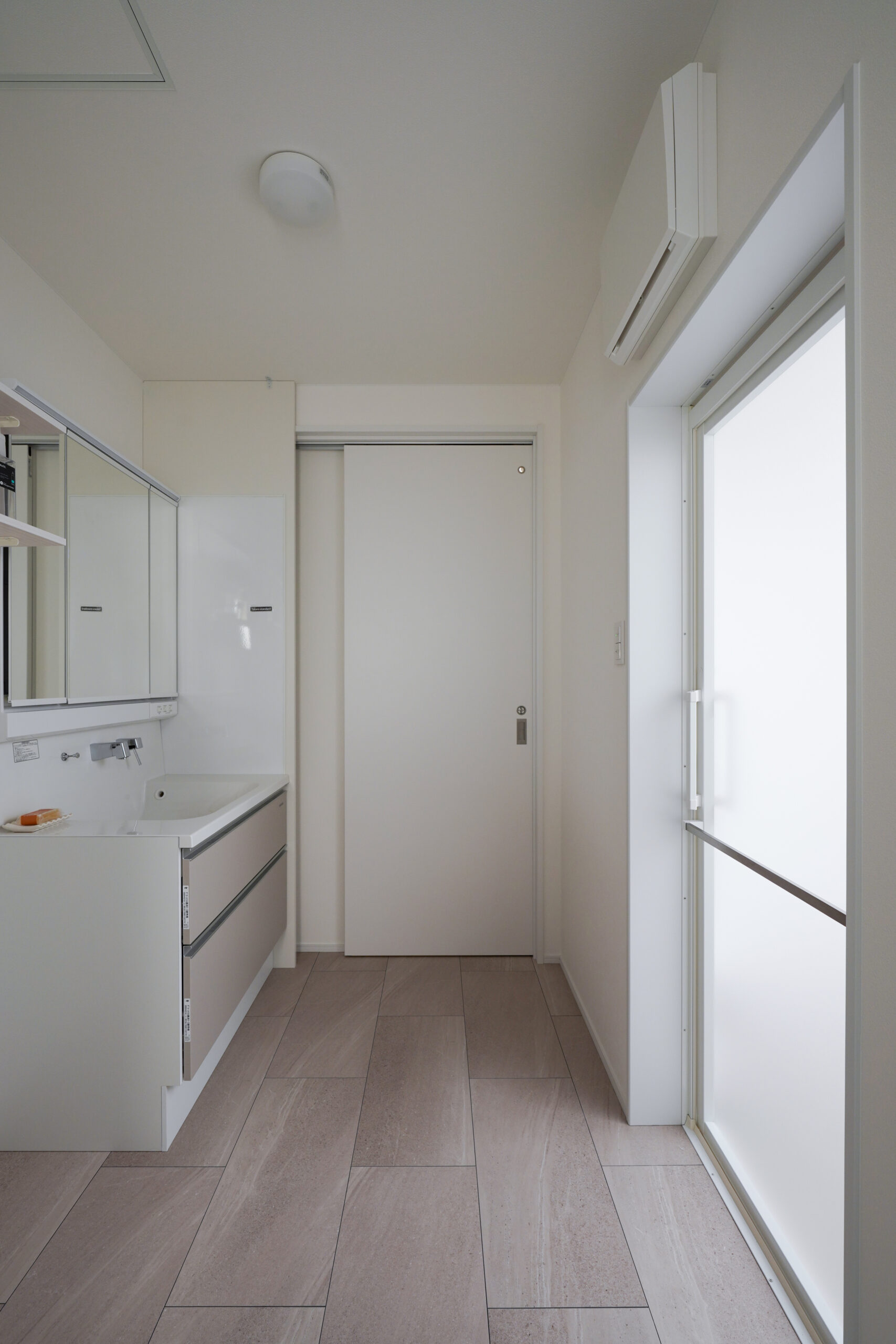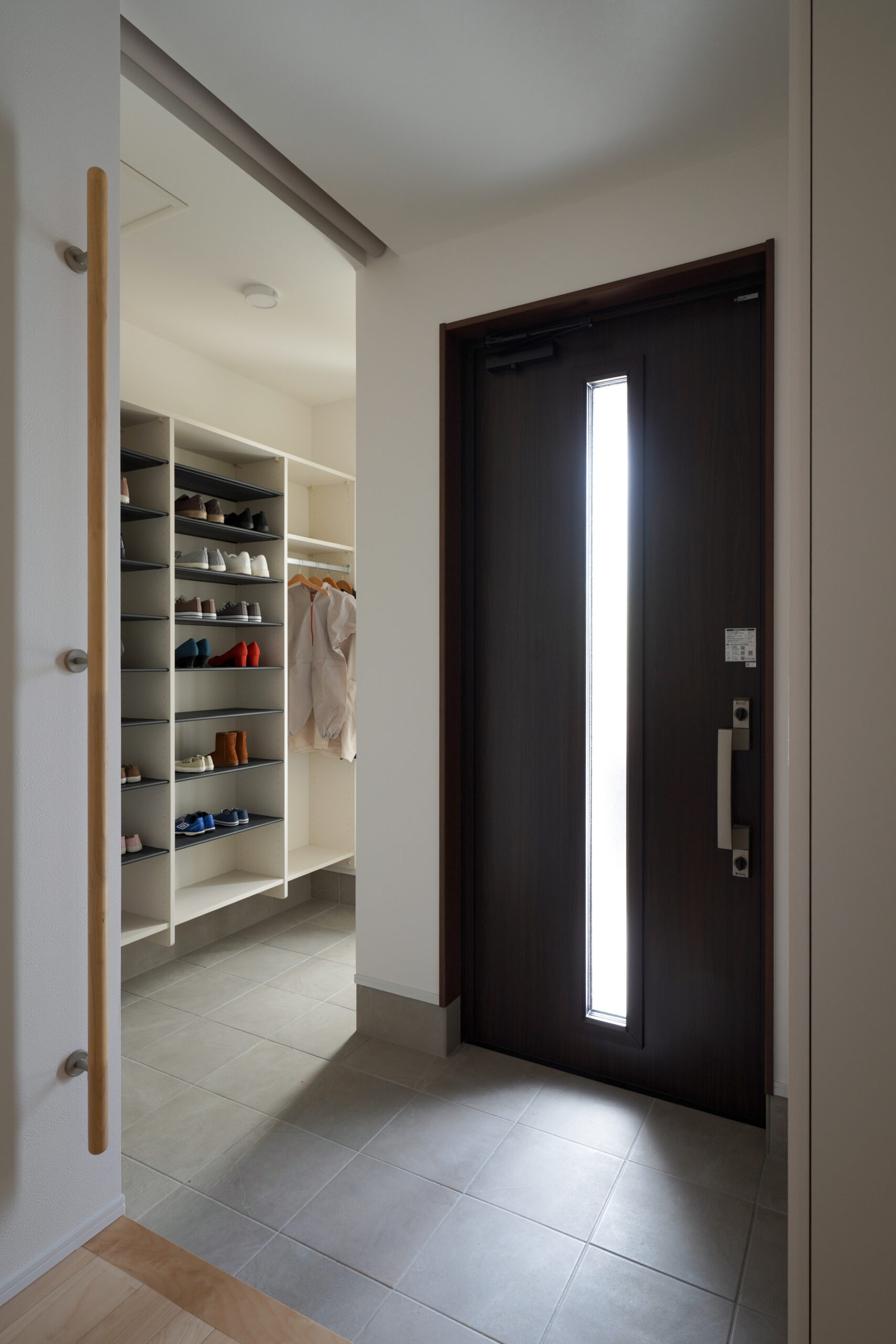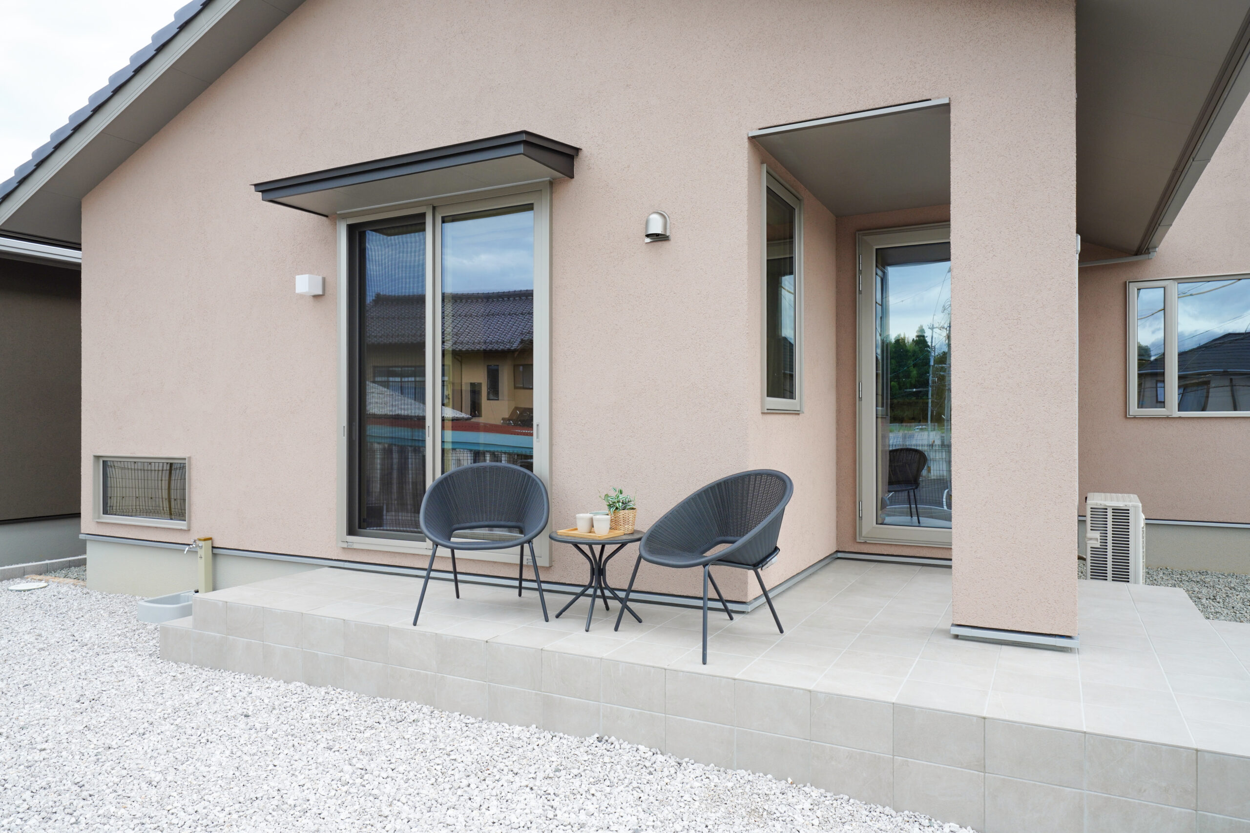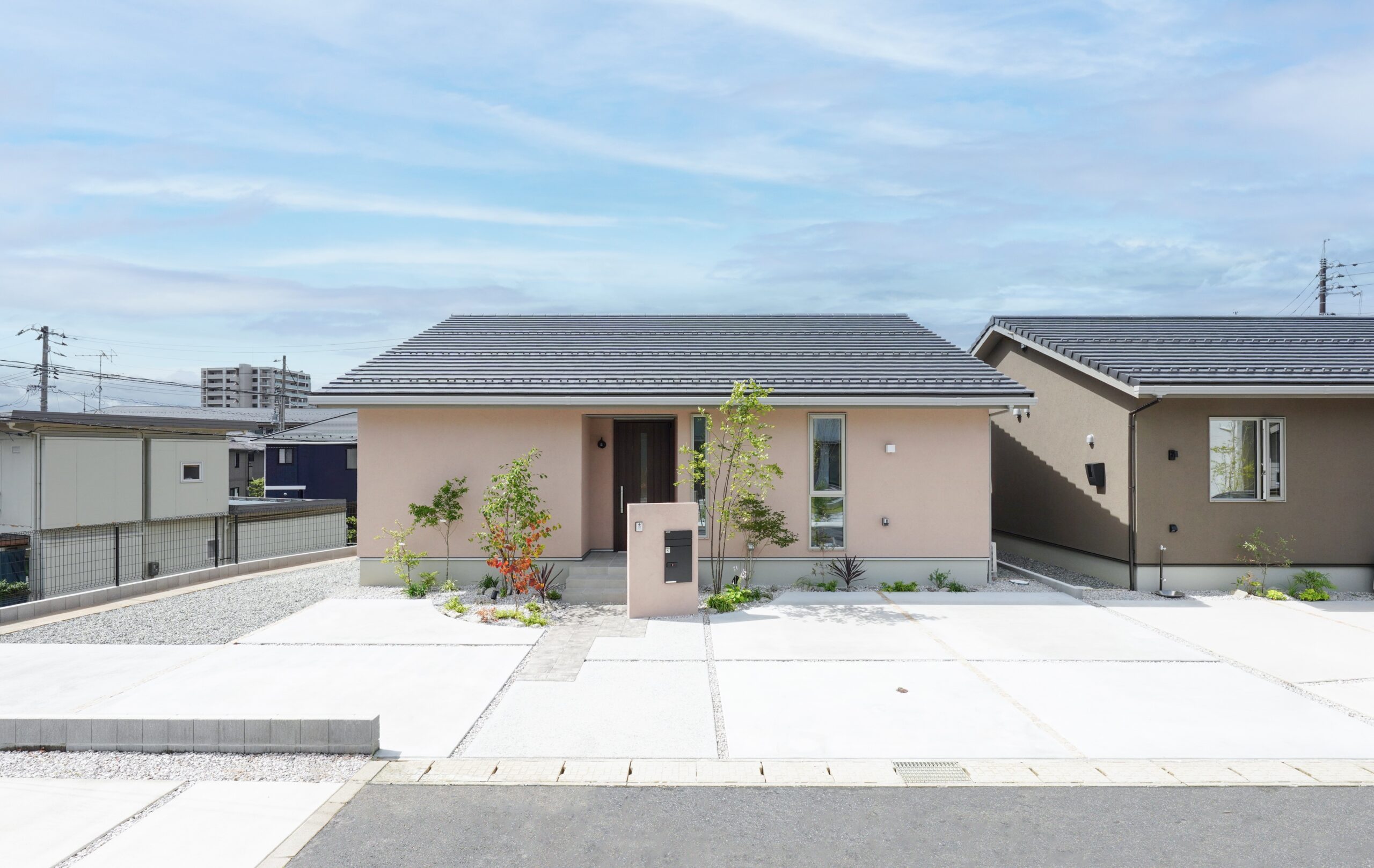 北入り口のシンプルで洗練されたファサードデザインが、落ち着いた品格を演出。玄関から家の中が見えにくい工夫で、プライバシーを確保しながらも開放感を感じさせる設計です。霞がかったグレイッシュな外壁と銀黒の屋根が織りなすミスティカラーは、自然の景色とも調和し、時を経ても美しさを保ちます。平屋ならではの安心感と、エレガントな外観が心を豊かにする住まいです。