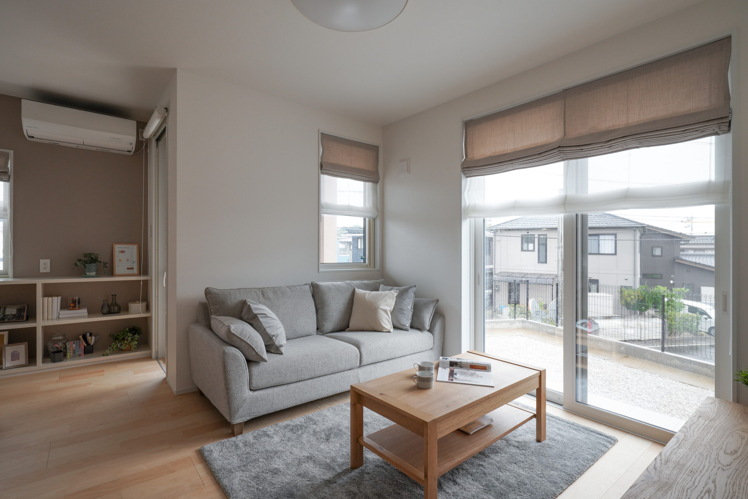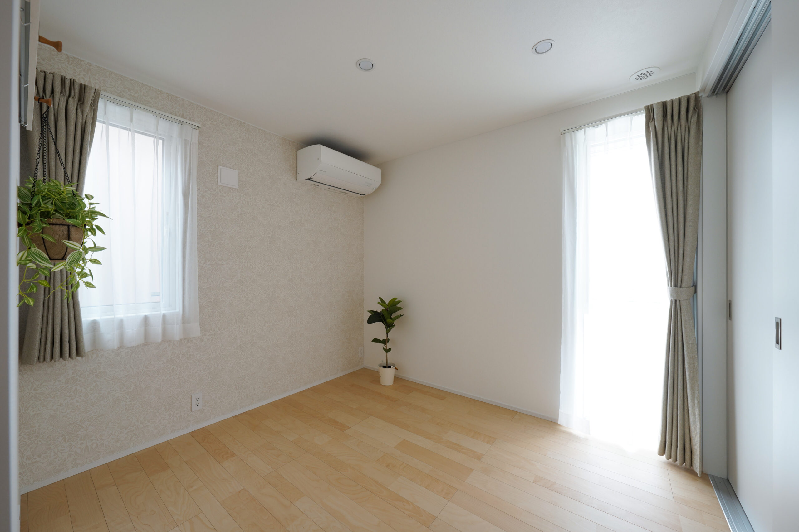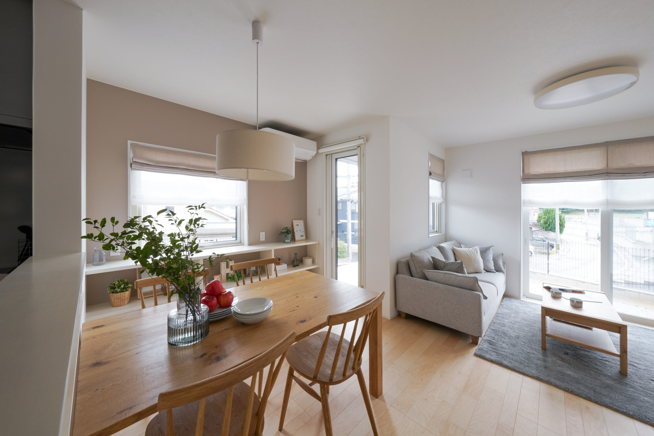 玄関を開けると正面にはアクセントウォールがあり、リビングドアを設けなくても家の中が丸見えにならない工夫が。プライバシーを守りながらも、家族が集う空間へ自然に繋がります。寝室は水回りに近い配置で、日々の生活から将来の安心まで考えられた動線設計。畳コーナーは大きな間口を採用し、リビングとの一体感を保ちながら、個室としても活用可能。日当たりと見晴らしに恵まれたリビングダイニング、そして開放的で風通しの良い洋室が、暮らしに心地よさと豊かさをもたらします。