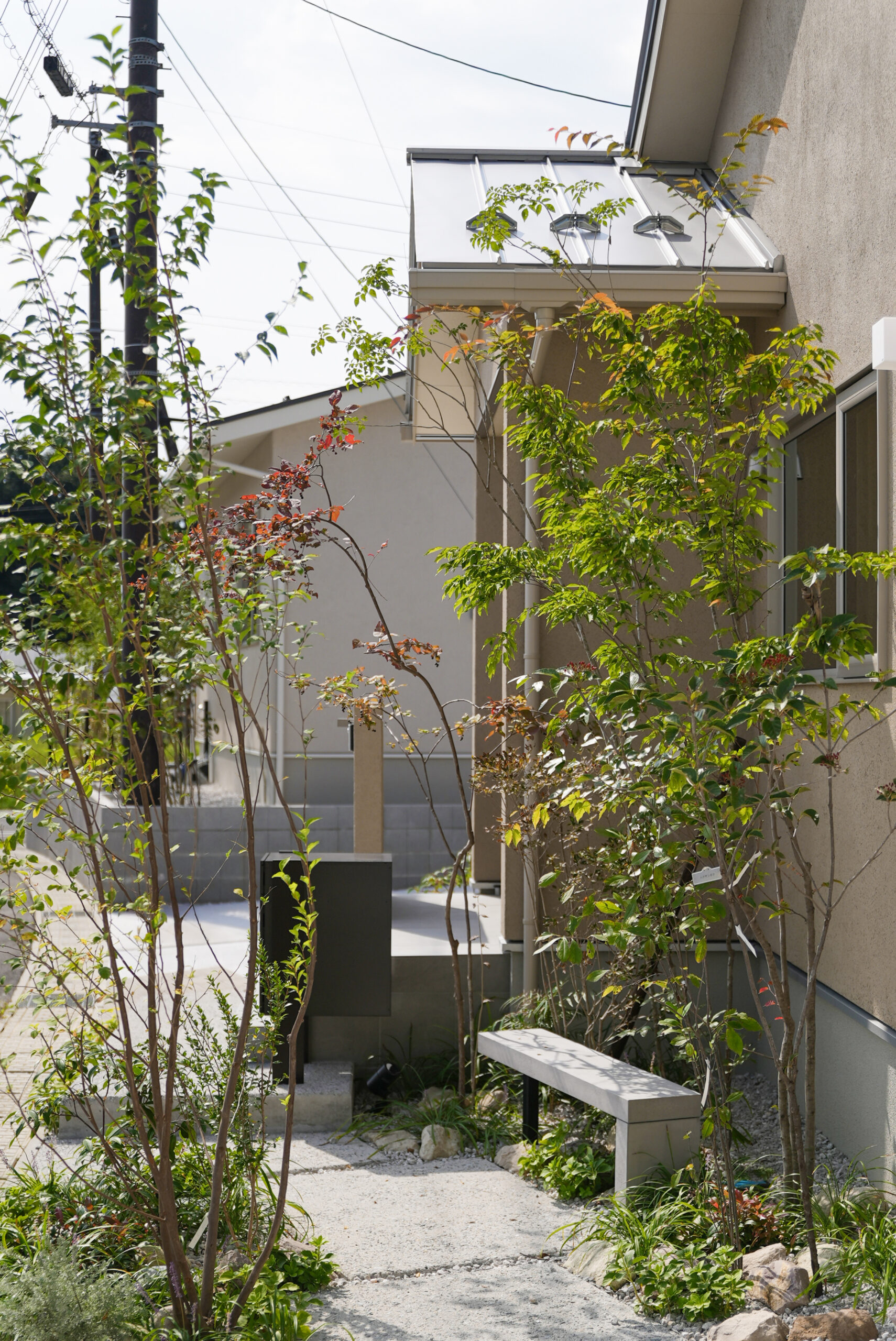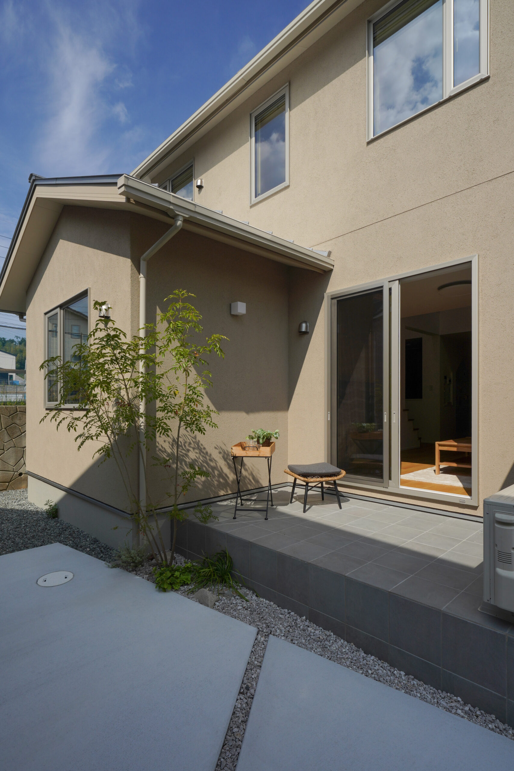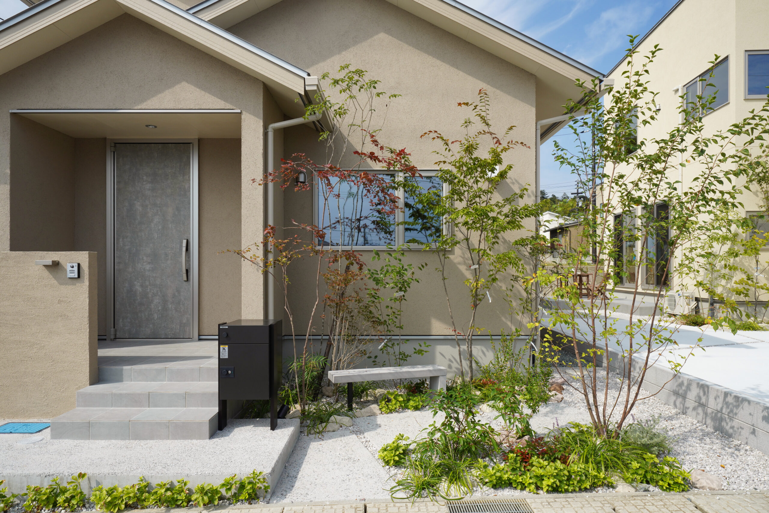 ダイナミックな切妻屋根とグレイッシュなベージュ系の塗り壁が織りなす、上品かつ存在感のある佇まい。全体をやさしい色でまとめながらも、シルバーの屋根がシャープな印象を与えます。南に配置したタイルテラスは、壁付きで道路側からの視線をシャットアウト。人目を気にせずくつろげる空間です。また、道路に面する北側はお庭スペースに。植栽が映え、住む人にも道行く人にも安らぎを与えます。