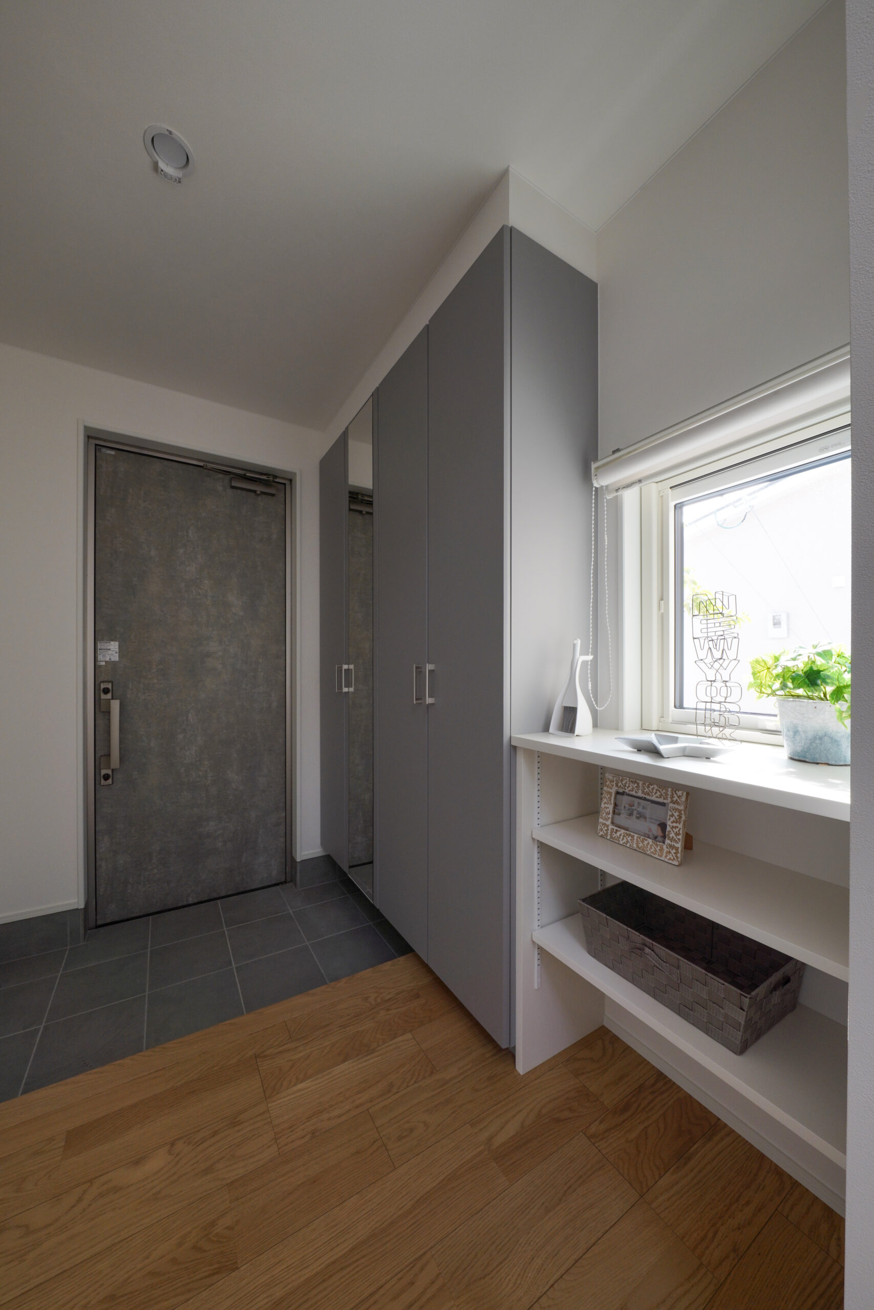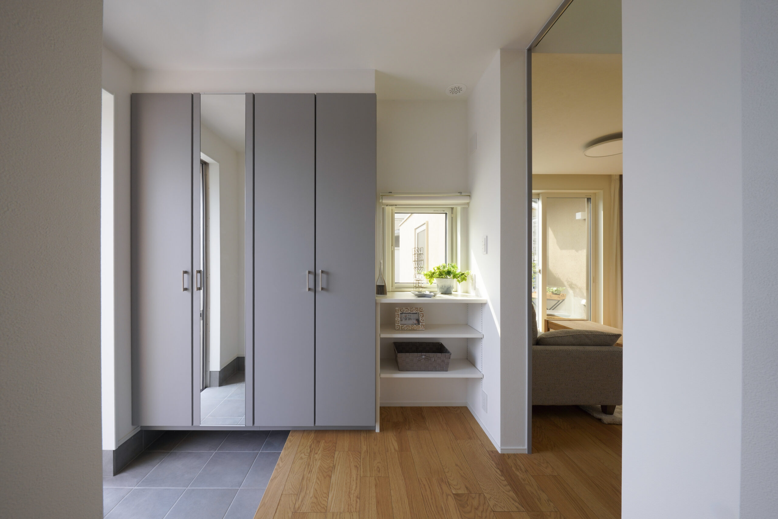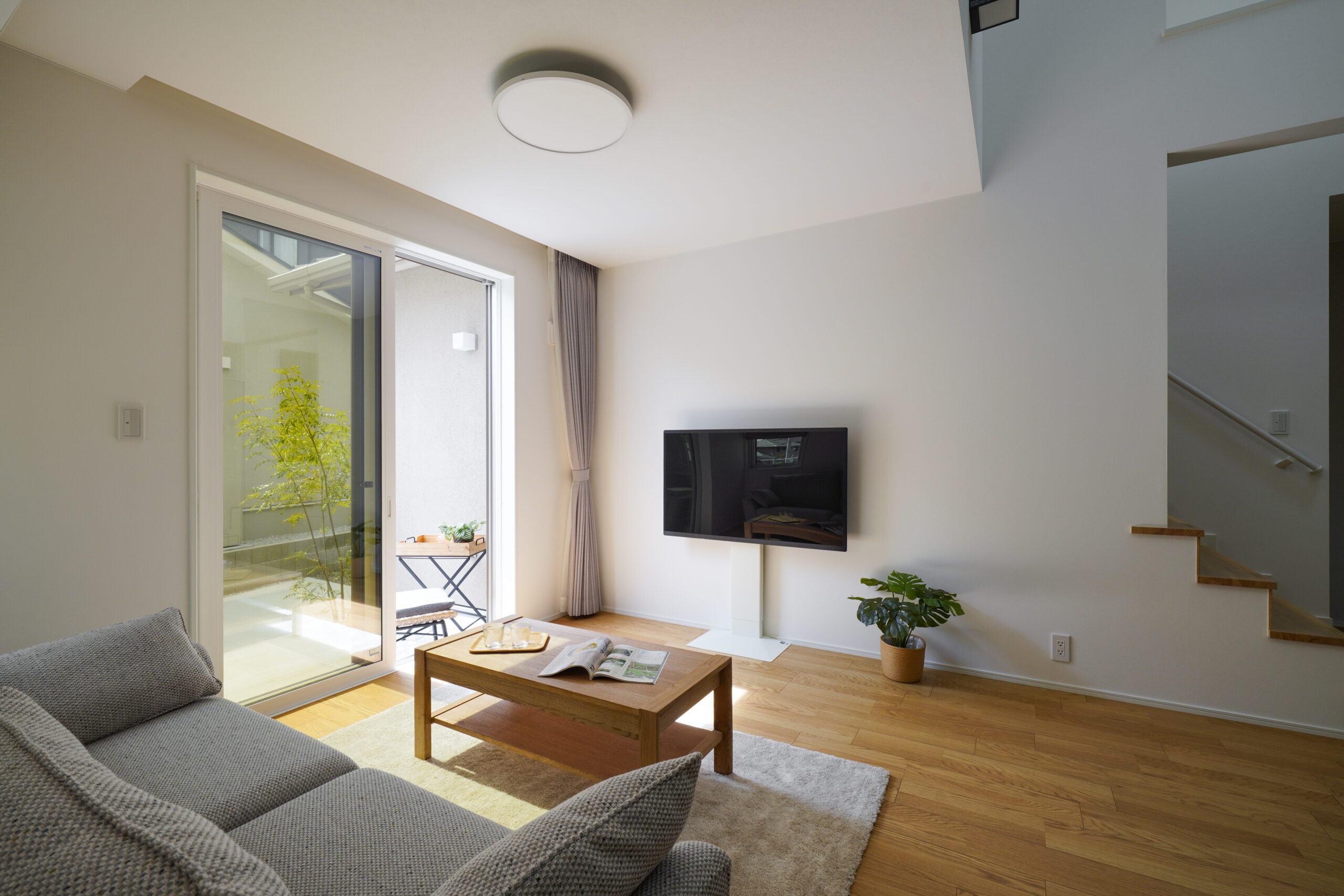 ダイナミックな切妻屋根とグレイッシュなベージュ系の塗り壁が織りなす、上品かつ存在感のある佇まい。全体をやさしい色でまとめながらも、シルバーの屋根がシャープな印象を与えます。南に配置したタイルテラスは、壁付きで道路側からの視線をシャットアウト。人目を気にせずくつろげる空間です。また、道路に面する北側はお庭スペースに。植栽が映え、住む人にも道行く人にも安らぎを与えます。