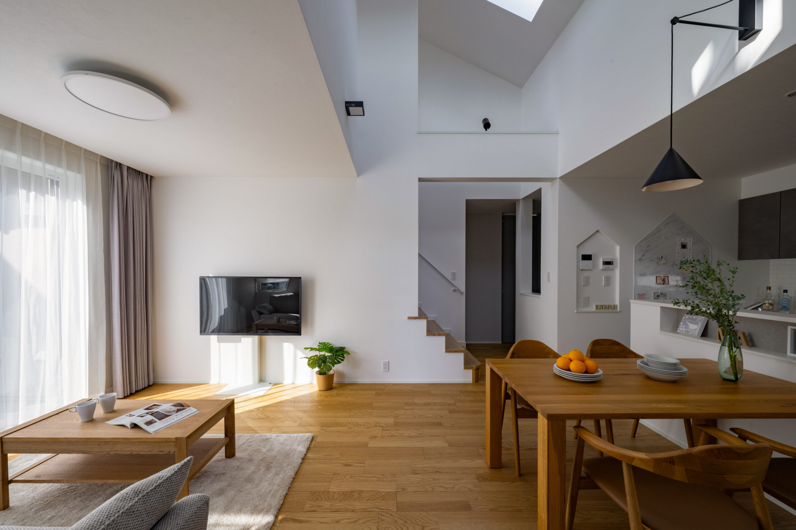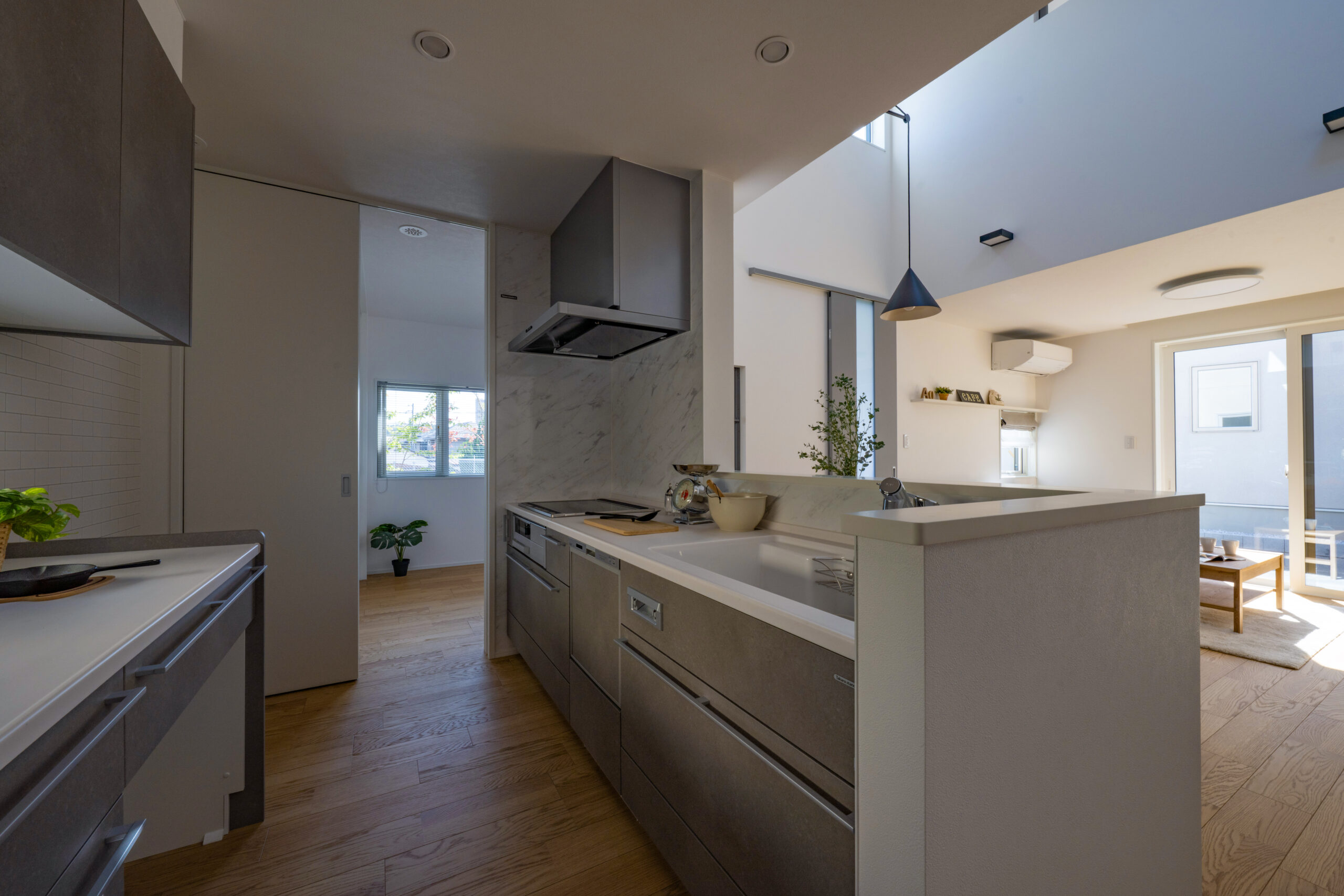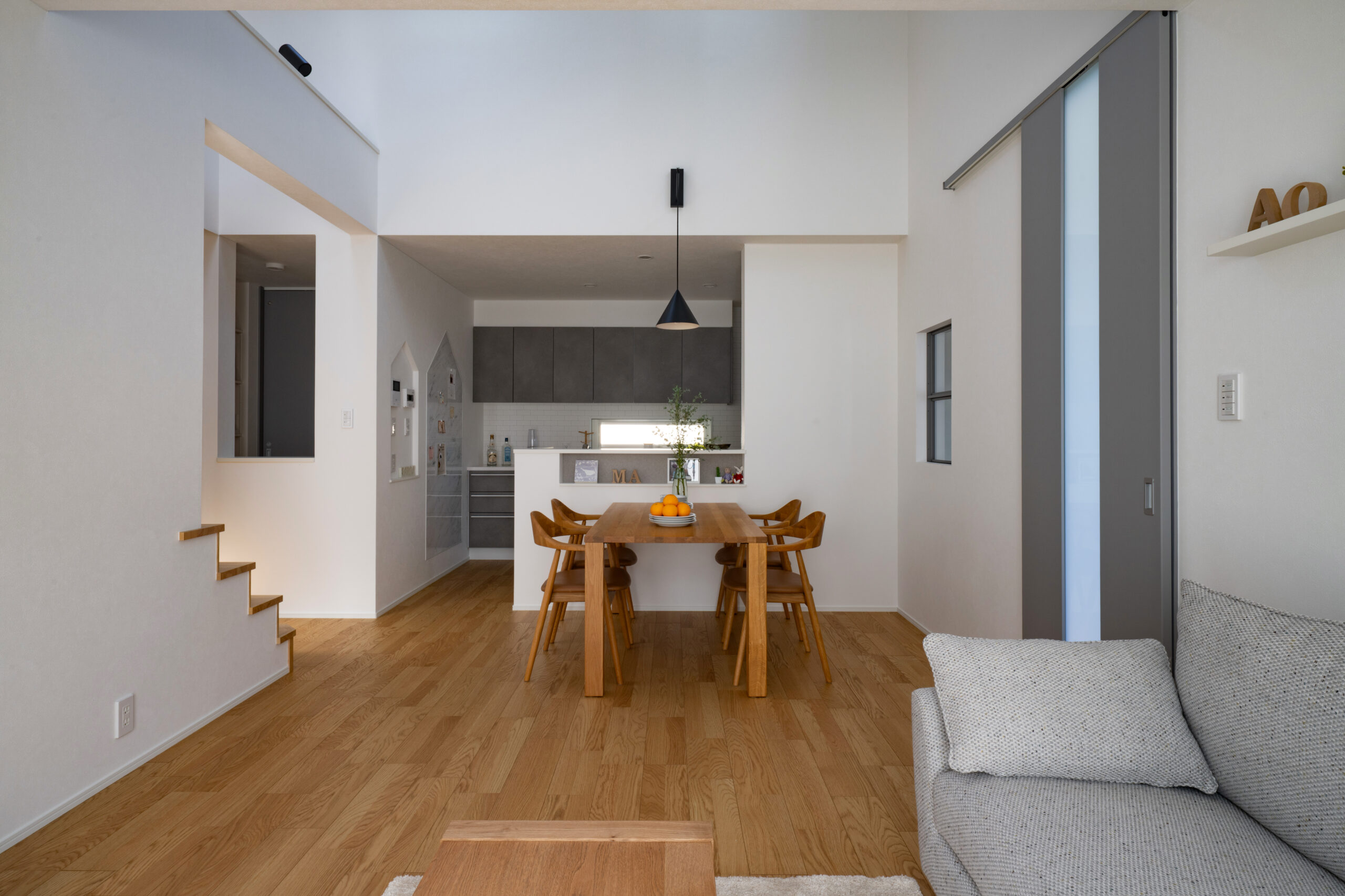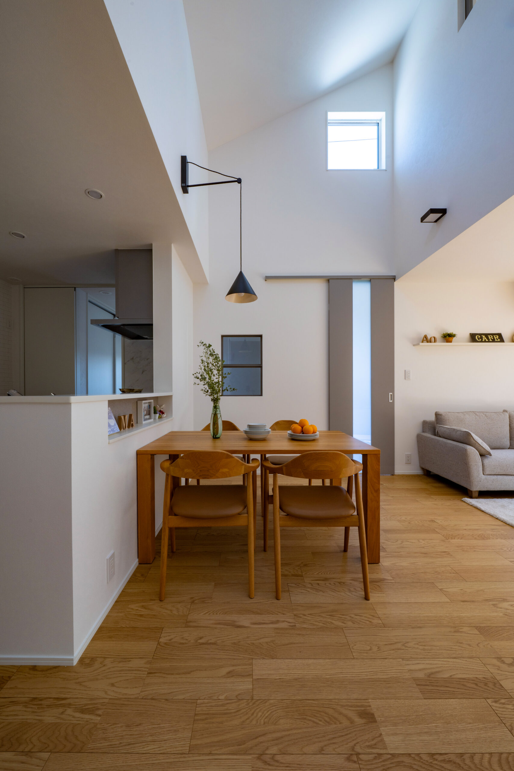 1階に寝室と洋室1部屋を設けた、まさに平屋ライクな暮らしができるお家。洋室は書斎やアトリエ、キッズスペースなど様々な使い道に夢が広がります。ダイニング上には勾配天井の吹き抜けを作りました。明るく開放感があり、毎日の食事も自然と笑顔に。お風呂や洗面はゆったりサイズに仕上げており、バタバタする時間でもストレスフリー。また、2階には子供部屋のみを配置。どの部屋も隣接していないので、家族がそれぞれの時間を大切にできます。