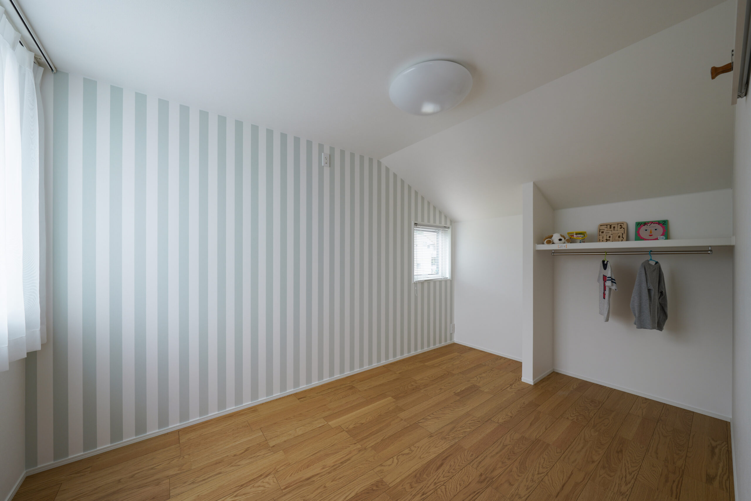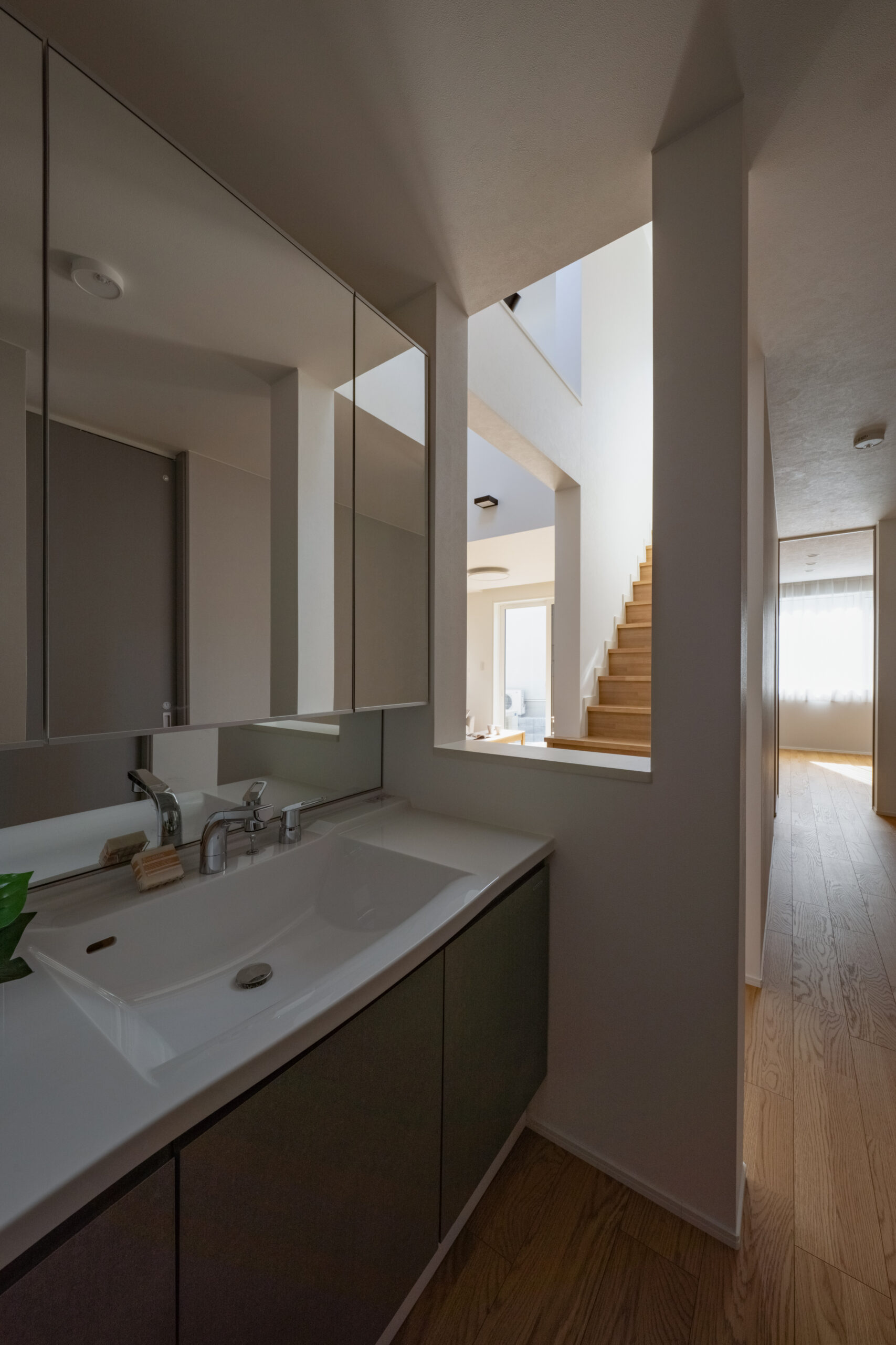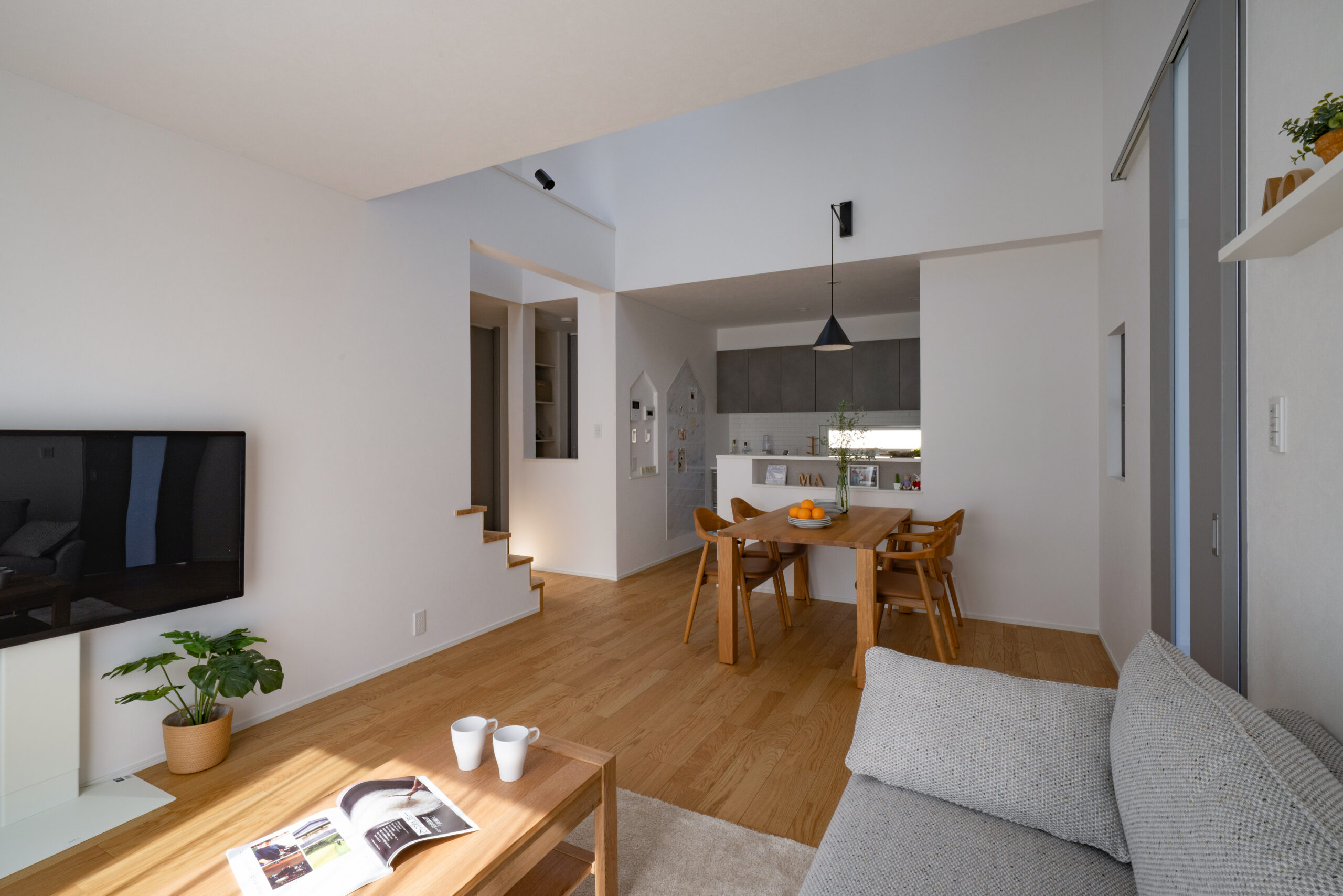 1階に寝室と洋室1部屋を設けた、まさに平屋ライクな暮らしができるお家。洋室は書斎やアトリエ、キッズスペースなど様々な使い道に夢が広がります。ダイニング上には勾配天井の吹き抜けを作りました。明るく開放感があり、毎日の食事も自然と笑顔に。お風呂や洗面はゆったりサイズに仕上げており、バタバタする時間でもストレスフリー。また、2階には子供部屋のみを配置。どの部屋も隣接していないので、家族がそれぞれの時間を大切にできます。