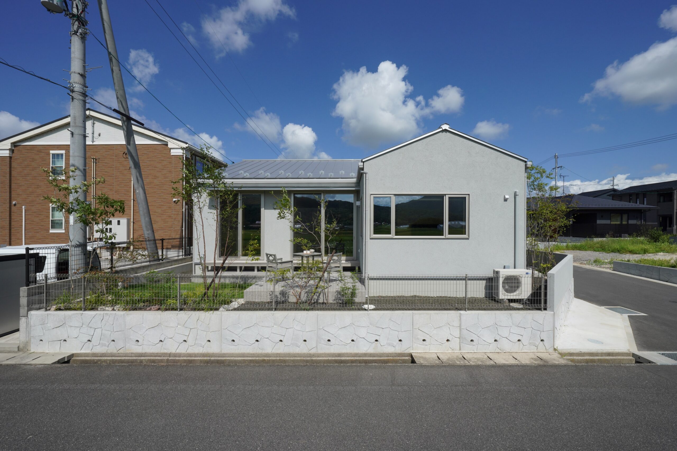 ライトグレーで統一された外観は、余計な装飾を省いたシンプルさが際立ち、洗練された印象を与えます。どこか落ち着いた雰囲気を感じさせ、周囲の自然や街並みと心地よく調和してくれます。
