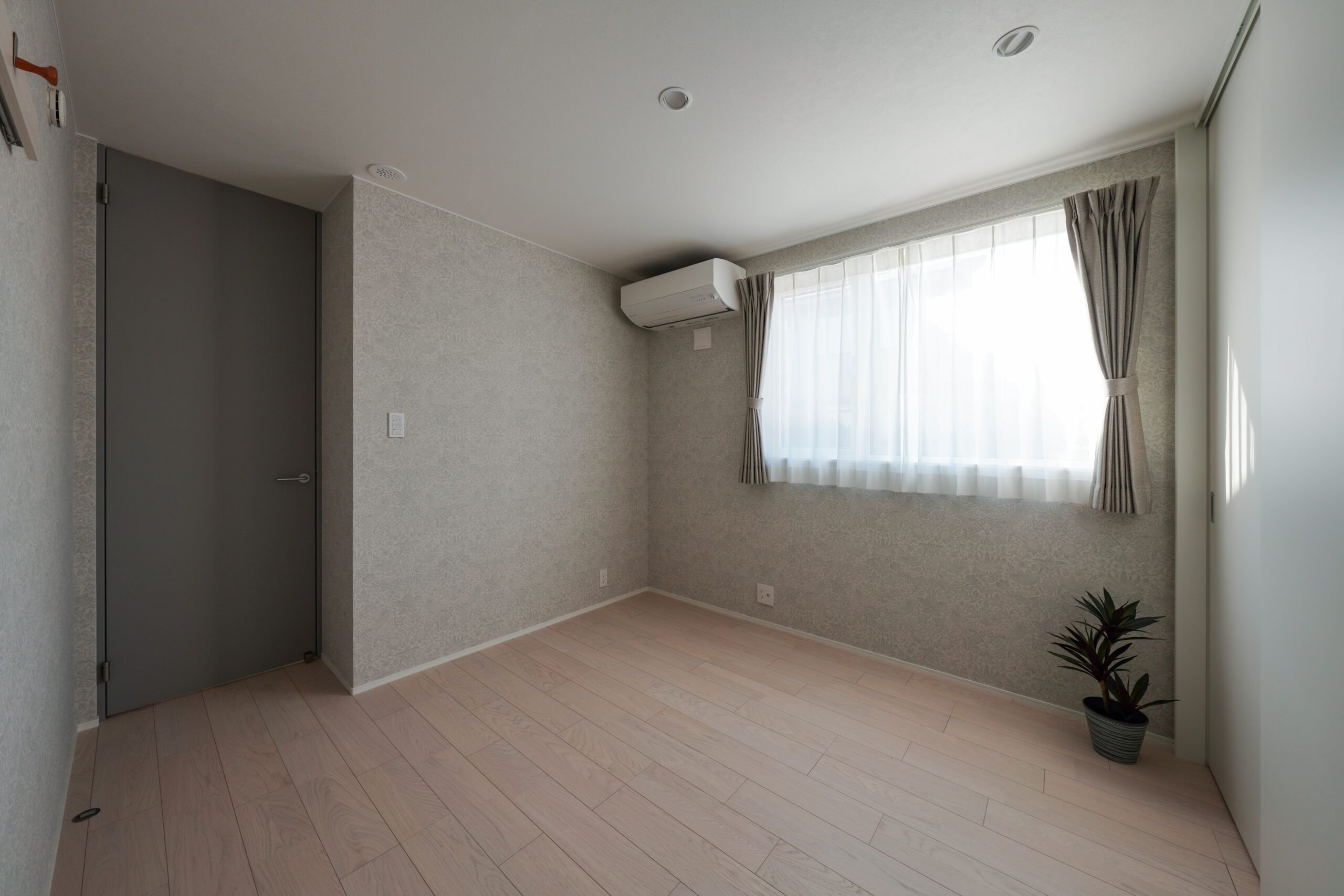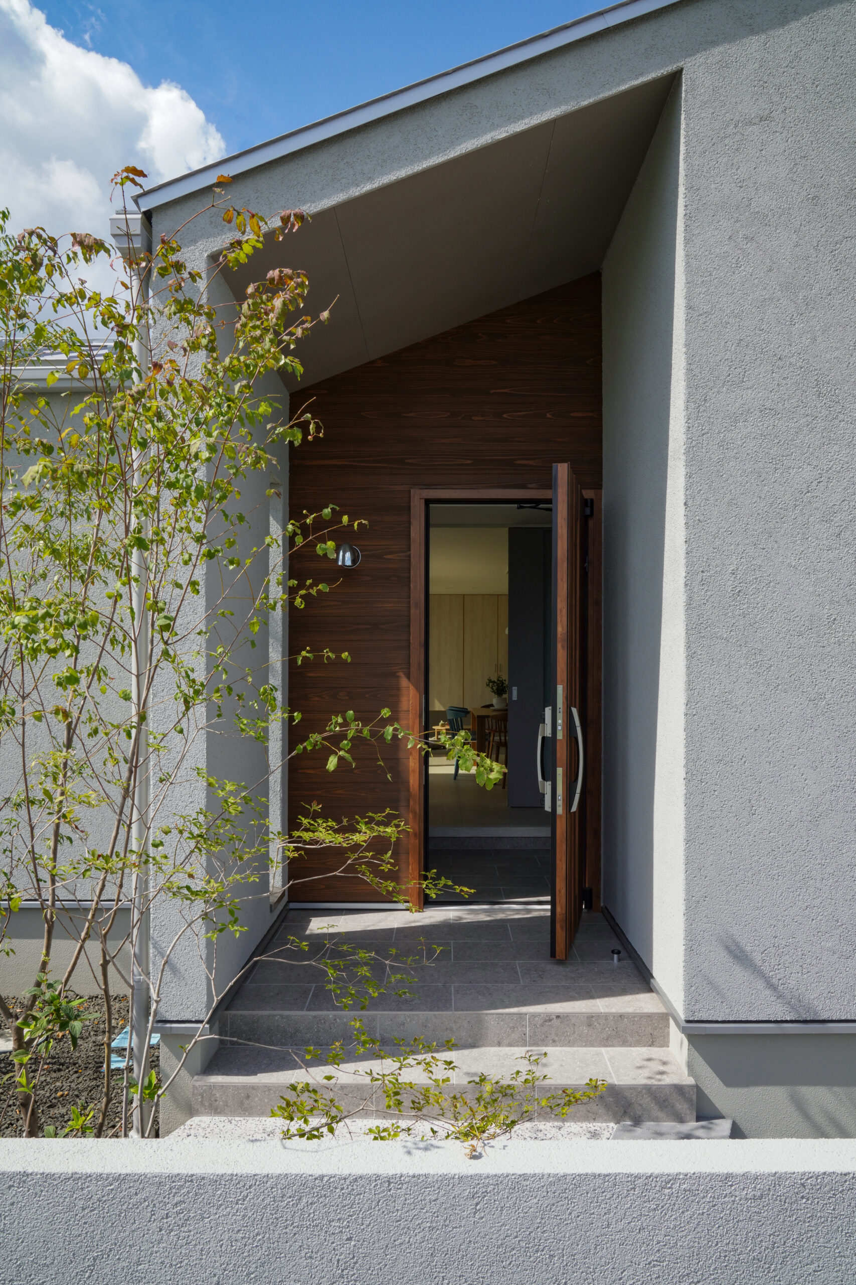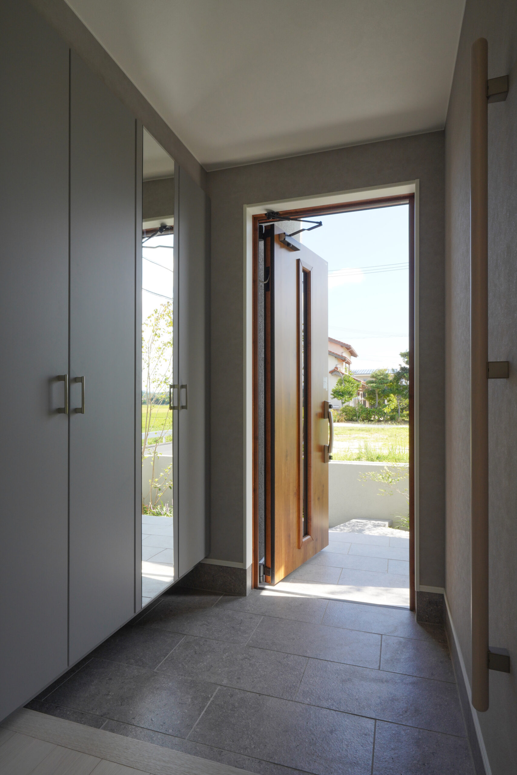 さらに、玄関周りには温かみのある木目をアクセントとして採用。 グレーの落ち着いた色調に優しい質感を添え、訪れる人を穏やかに迎え入れられる仕上がりです。