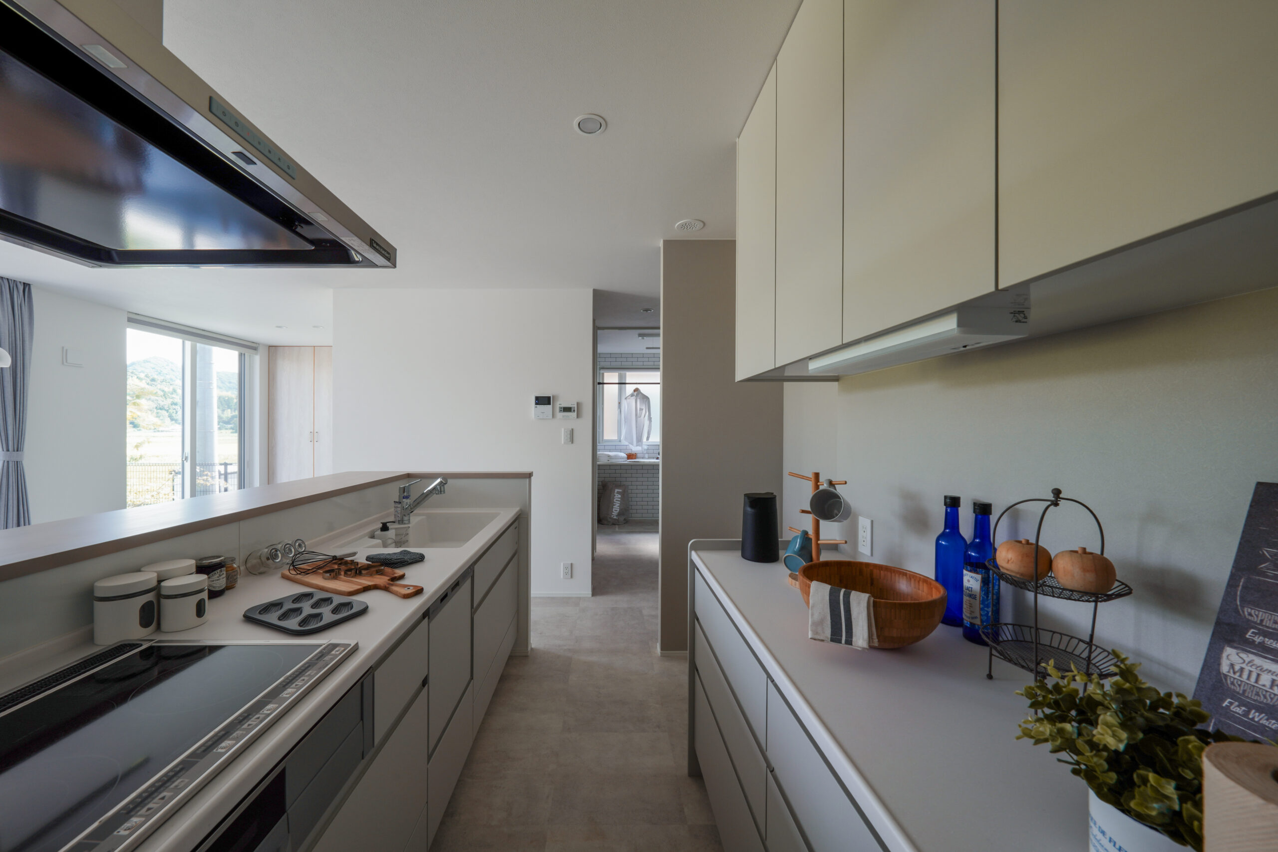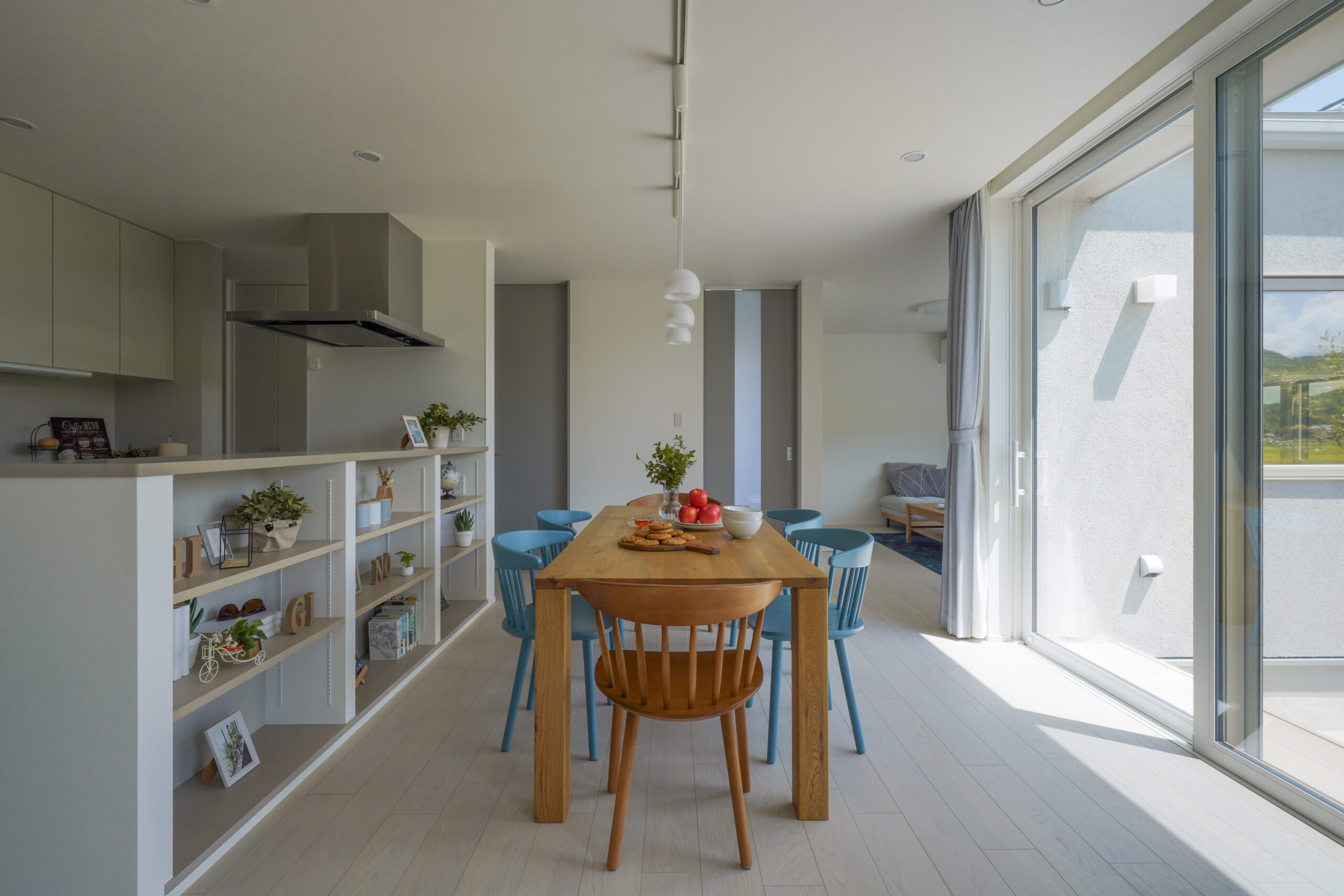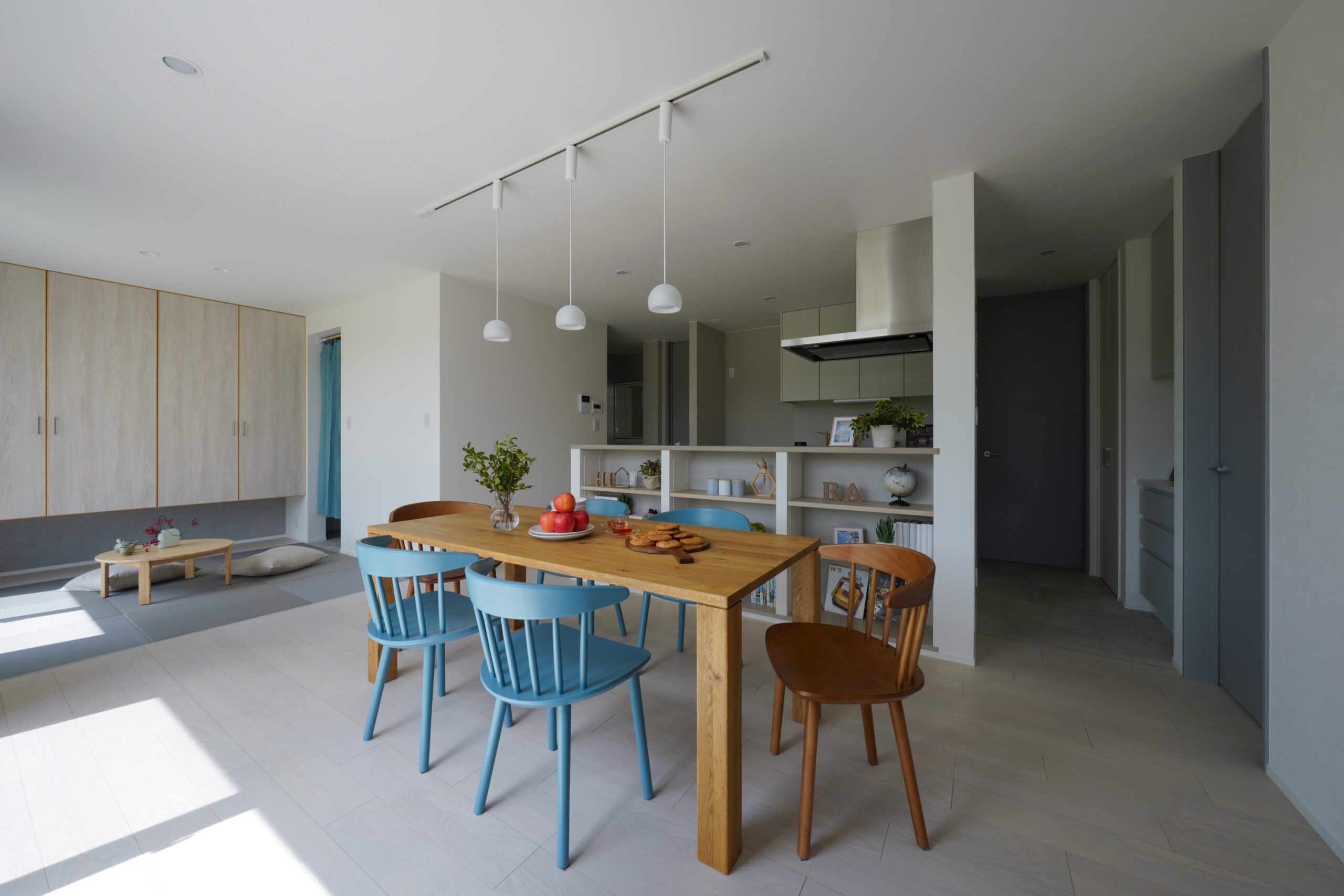 ライトグレーで統一された軒のないシンプルな外観は、周囲の自然や街並みと調和し、洗練された落ち着きのある印象を与えます。 玄関には木目のアクセントが施され、温かみのある優しい雰囲気が広がります。縁側のようなウッドデッキは、内と外を繋ぎ、季節の移ろいを身近に感じることのできる特別な空間。 広々としたLDKは、大きな窓から光が差し込み、開放感あふれる空間を実現しました。