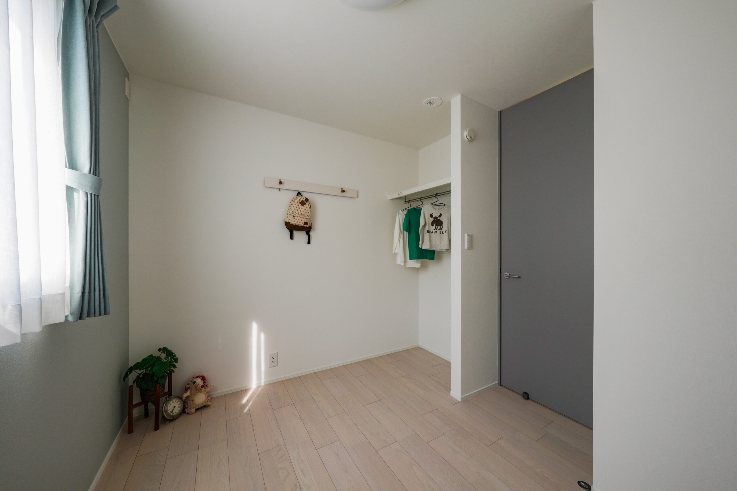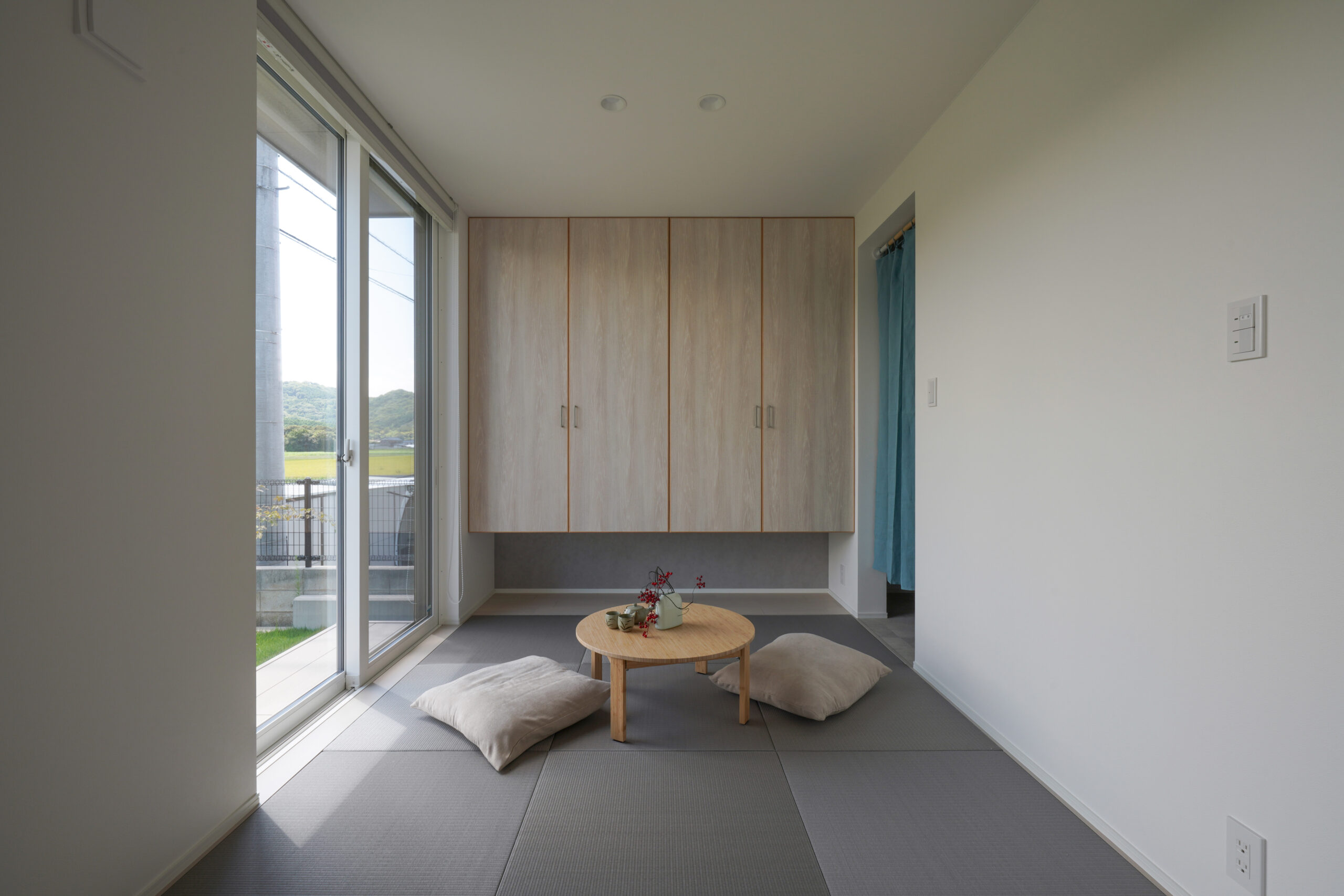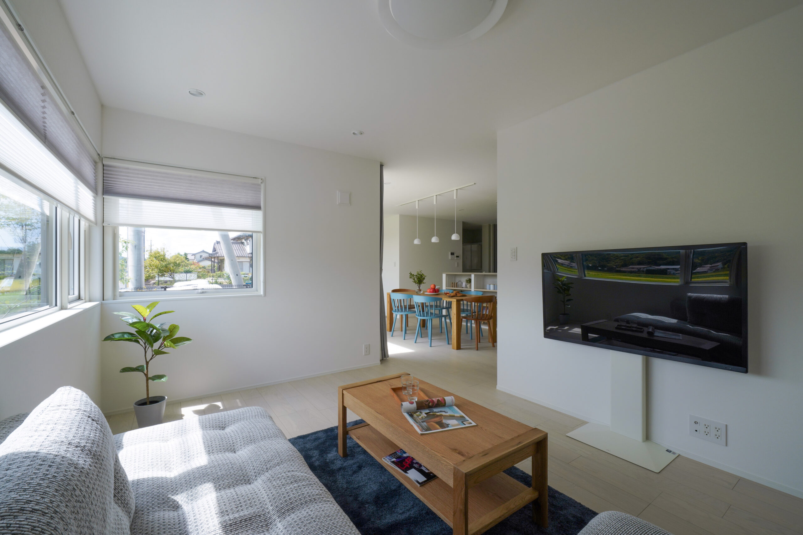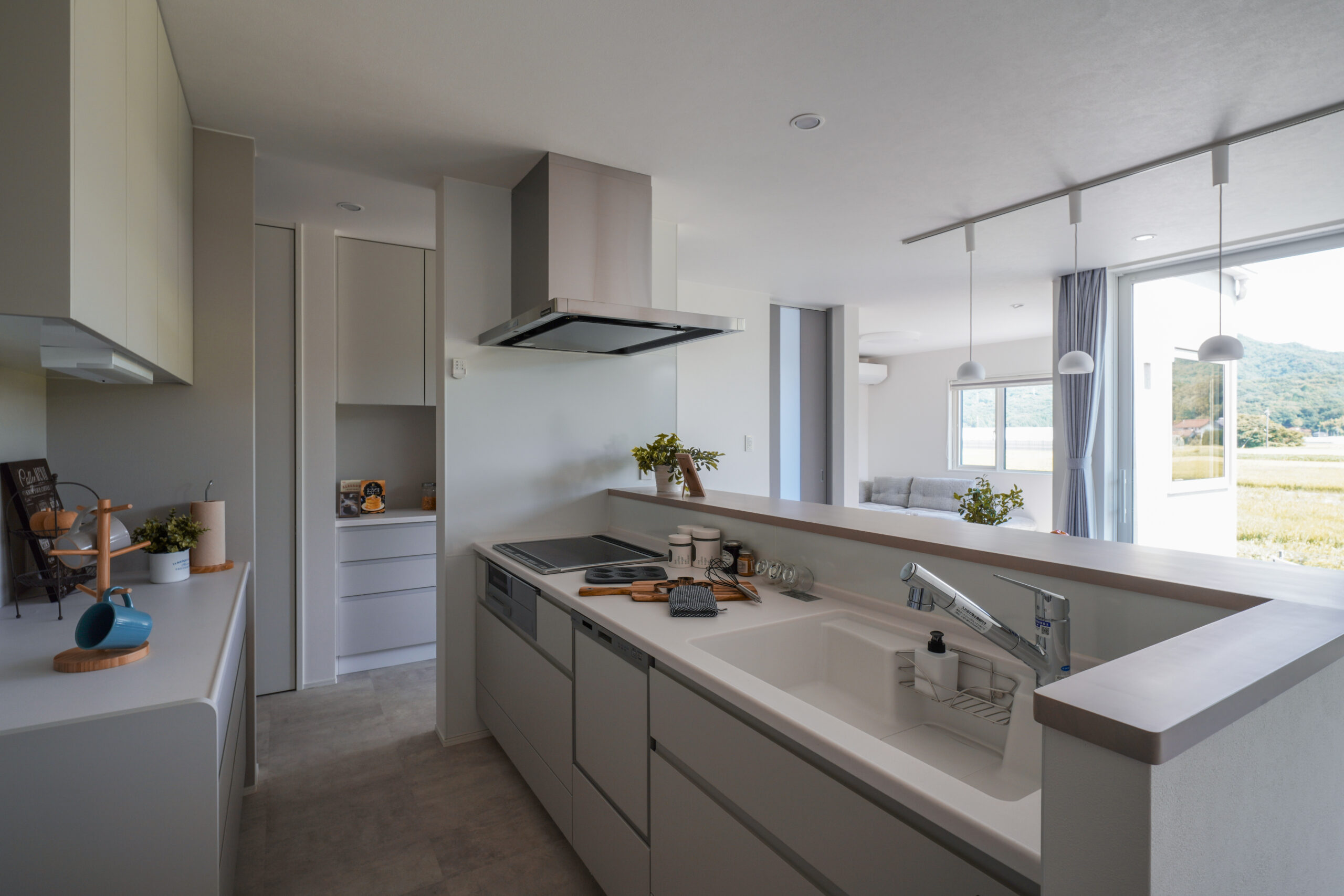 ライトグレーで統一された軒のないシンプルな外観は、周囲の自然や街並みと調和し、洗練された落ち着きのある印象を与えます。 玄関には木目のアクセントが施され、温かみのある優しい雰囲気が広がります。縁側のようなウッドデッキは、内と外を繋ぎ、季節の移ろいを身近に感じることのできる特別な空間。 広々としたLDKは、大きな窓から光が差し込み、開放感あふれる空間を実現しました。
