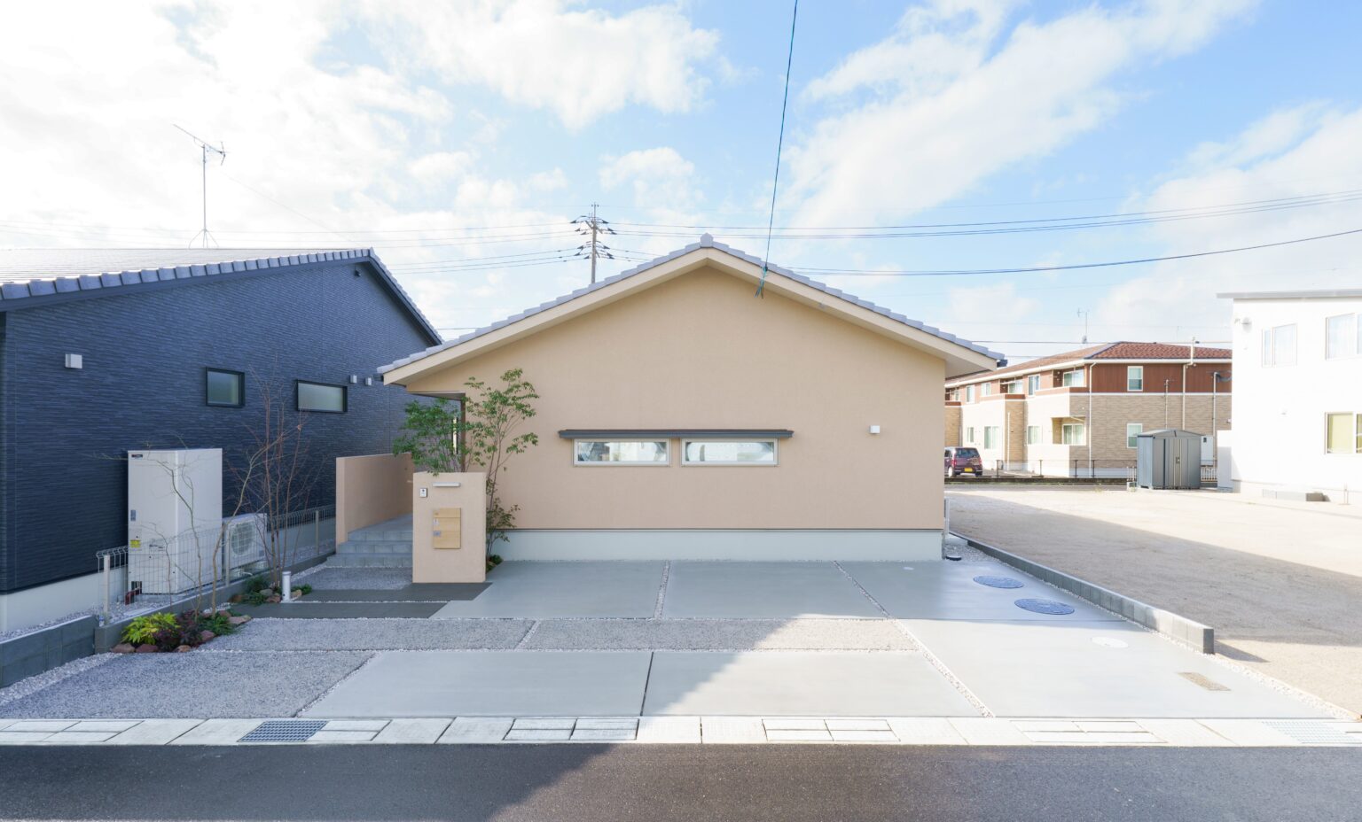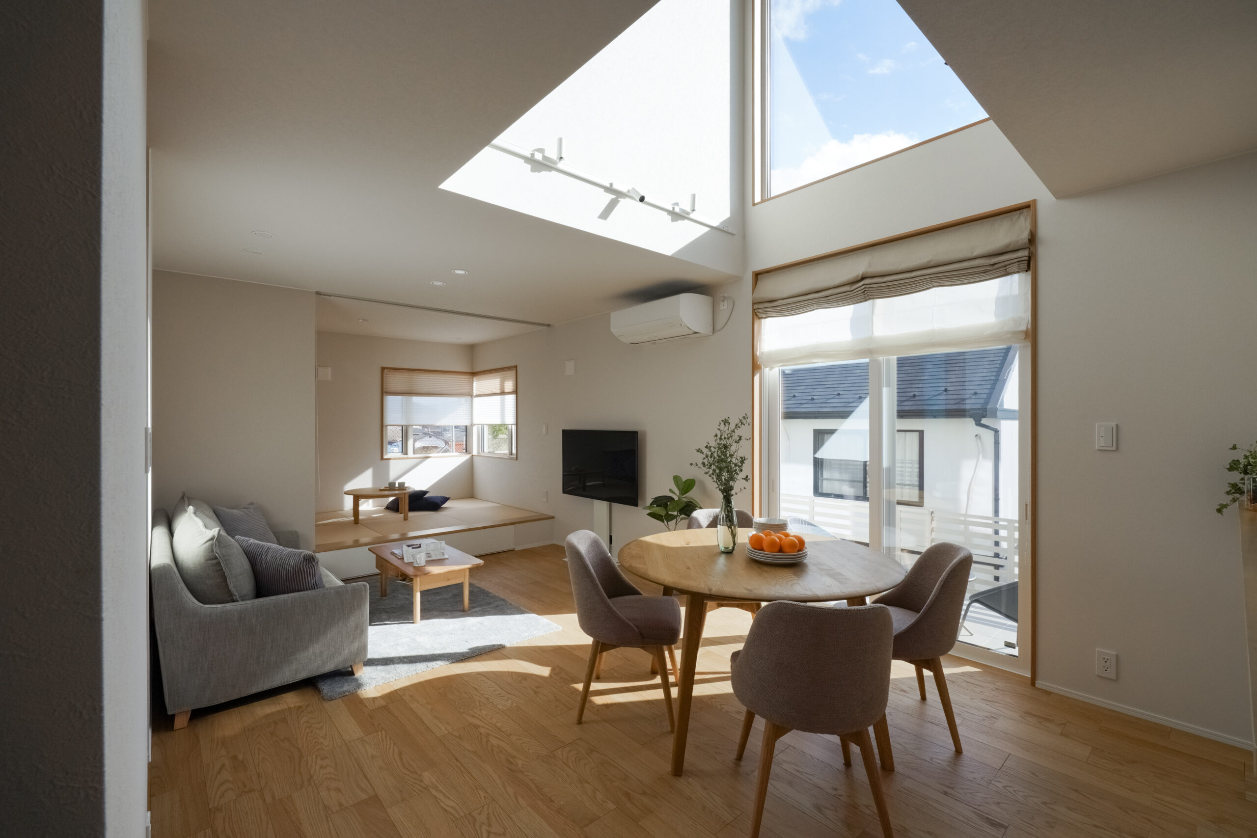シンプルで落ち着いた佇まいの外観が、住まう人には安らぎを、訪れる人には穏やかな印象をもたらします。中に入ると、2本の梁がアクセントになった大きな吹抜けが広がっていて、開放感もしっかりあります。南向きにLDKとタタミルームが並んだ、横幅約9.5mの大空間は、家族みんながゆったり過ごせる場所です。洗面台がお風呂と別に独立しているので、誰かが入浴中でも気兼ねなく使えるのがうれしいところ。2階には南向きの洋室が2部屋、そして主寝室にはたっぷり収納できるウォークインクローゼット付き。ホールにはちょっとした本棚スペースもつくったので、お気に入りの本を手に取って、そのまま自分の部屋へ。暮らしの中に、ちょっとした心地よさを散りばめた住まいです。