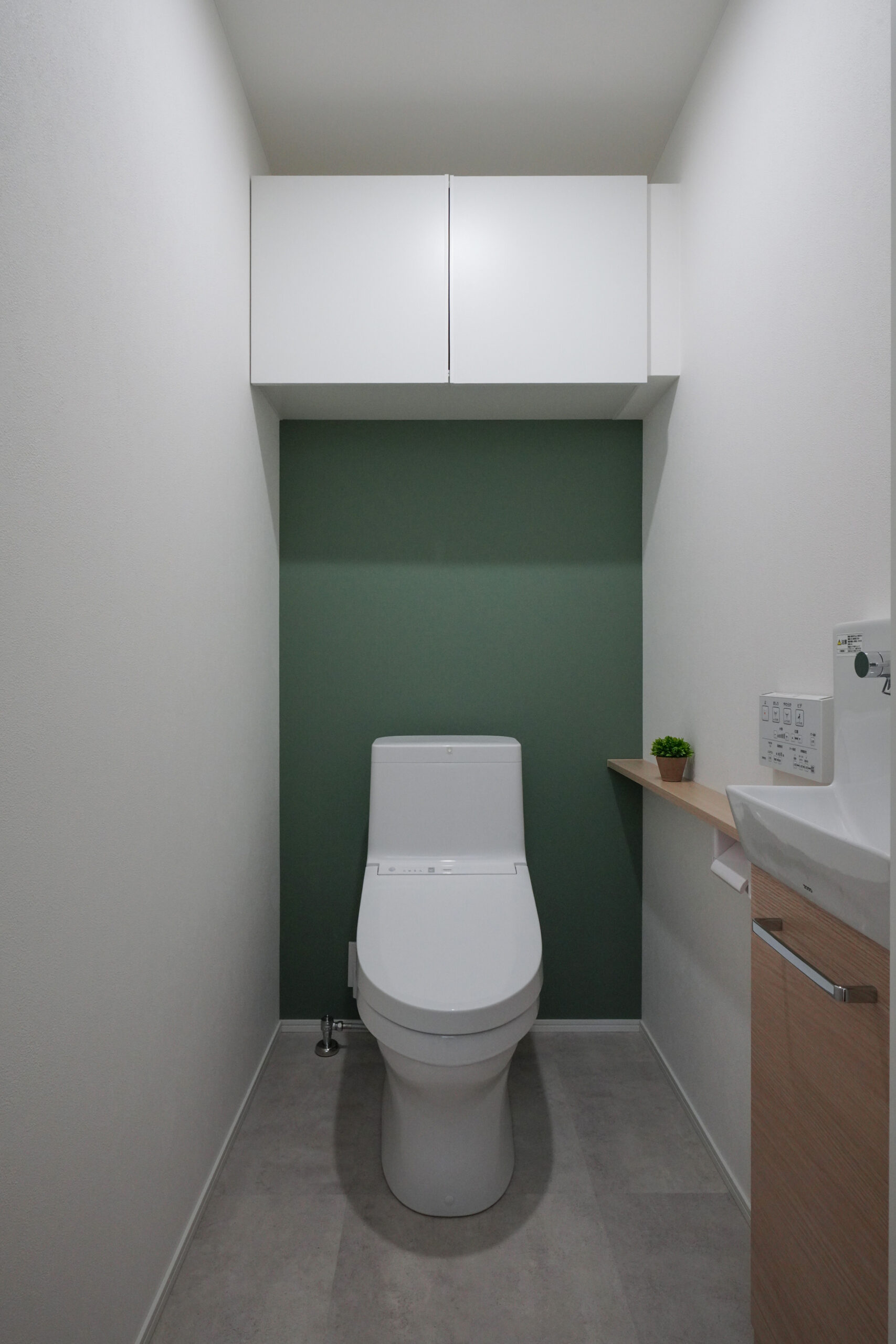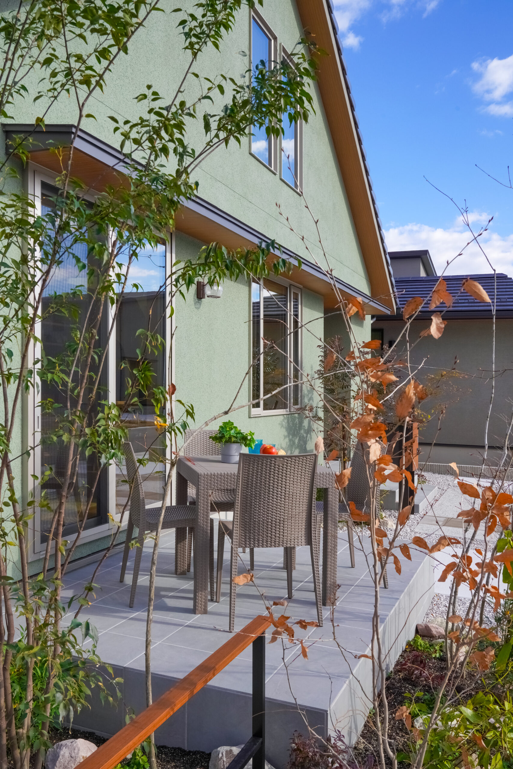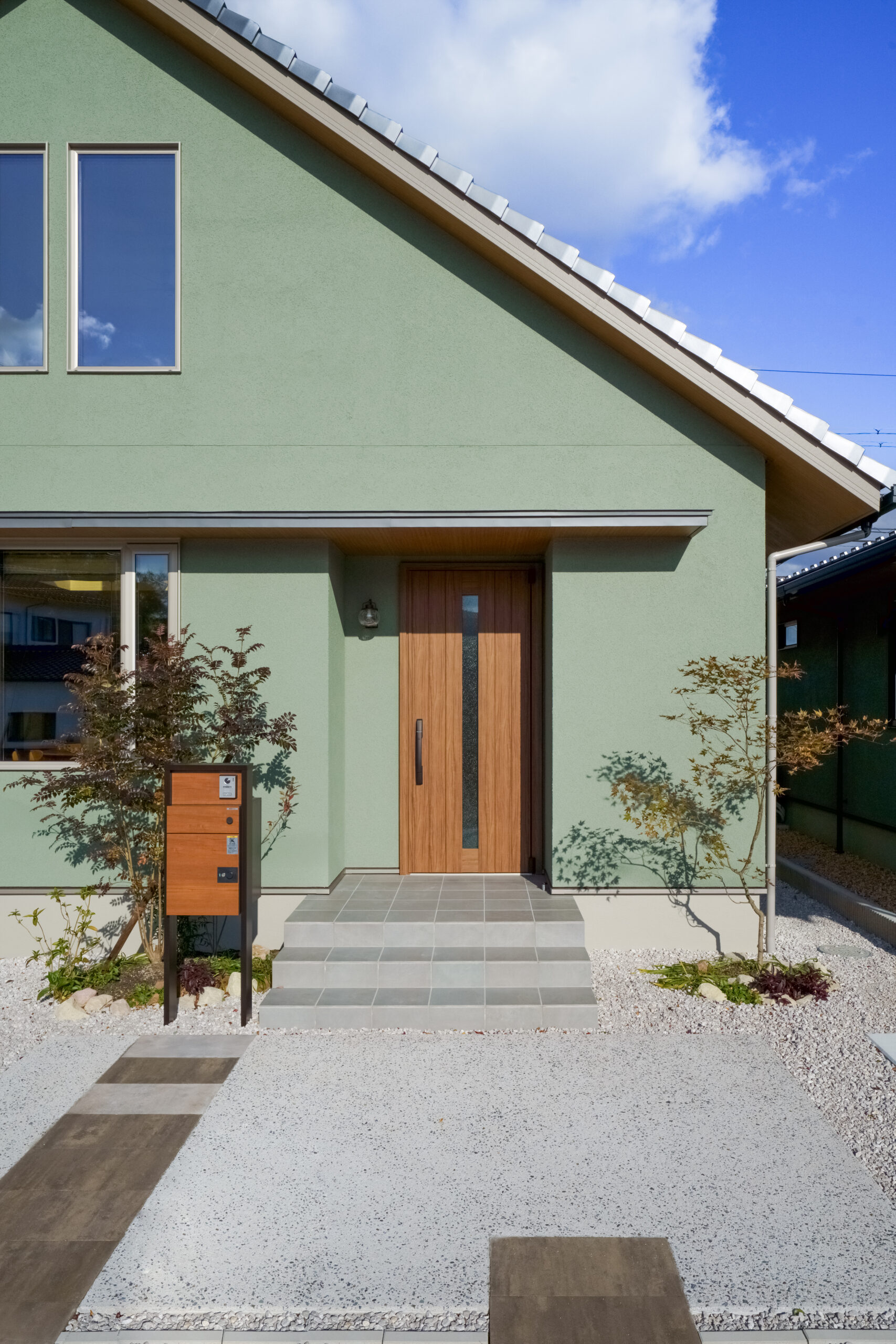 優しいグリーンテイストの外壁と銀黒の三角屋根が特徴的で、可愛らしくも落ち着いた和モダンの雰囲気を演出します。
