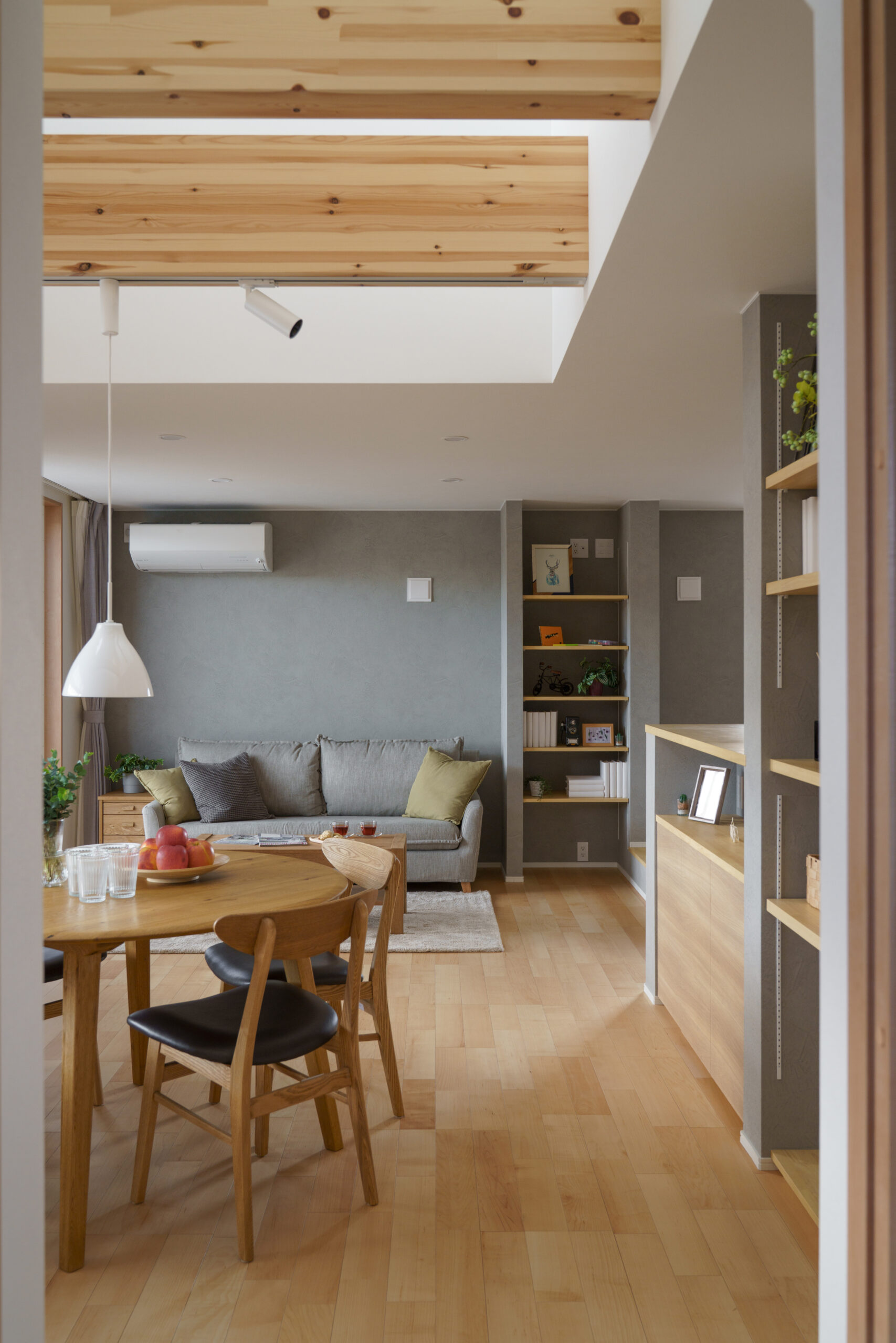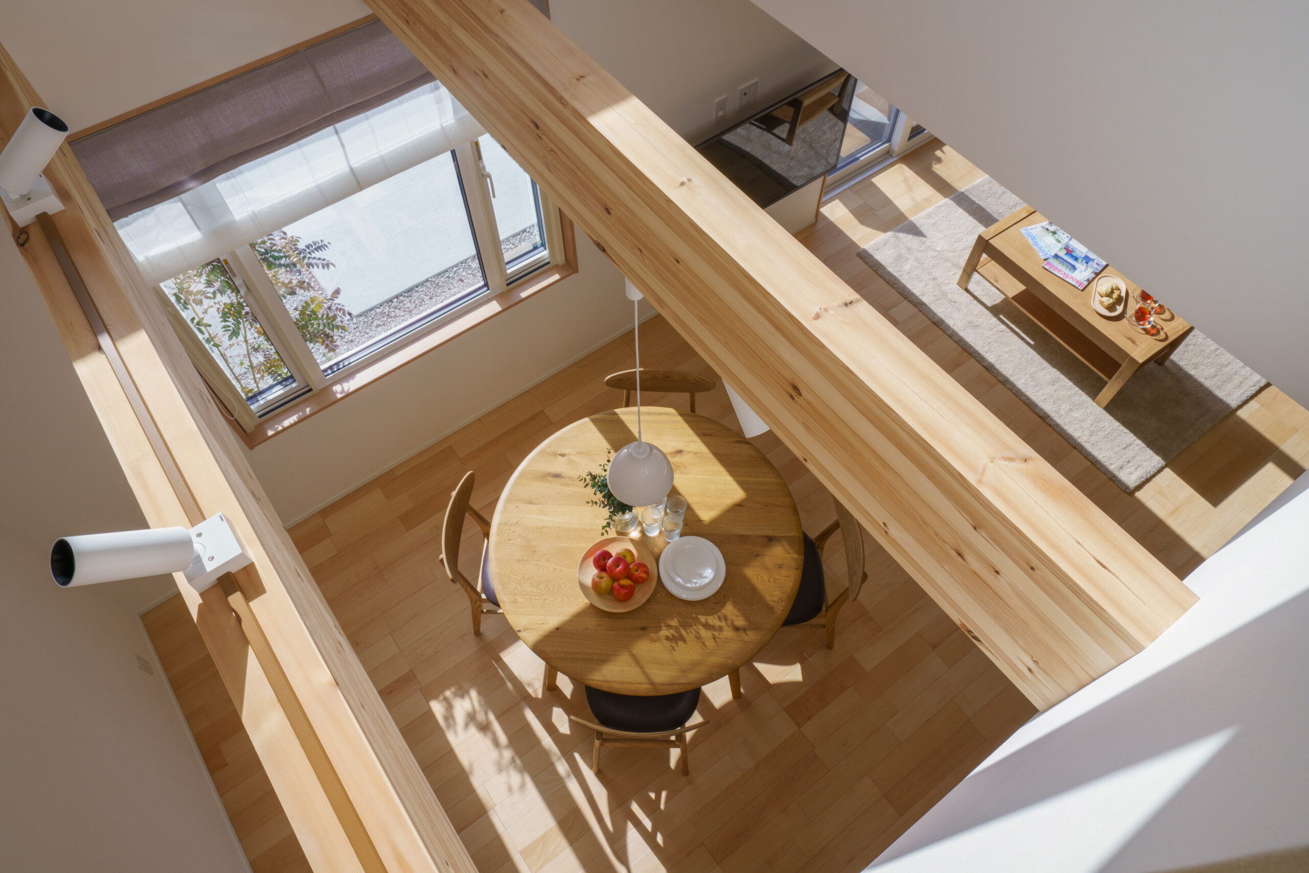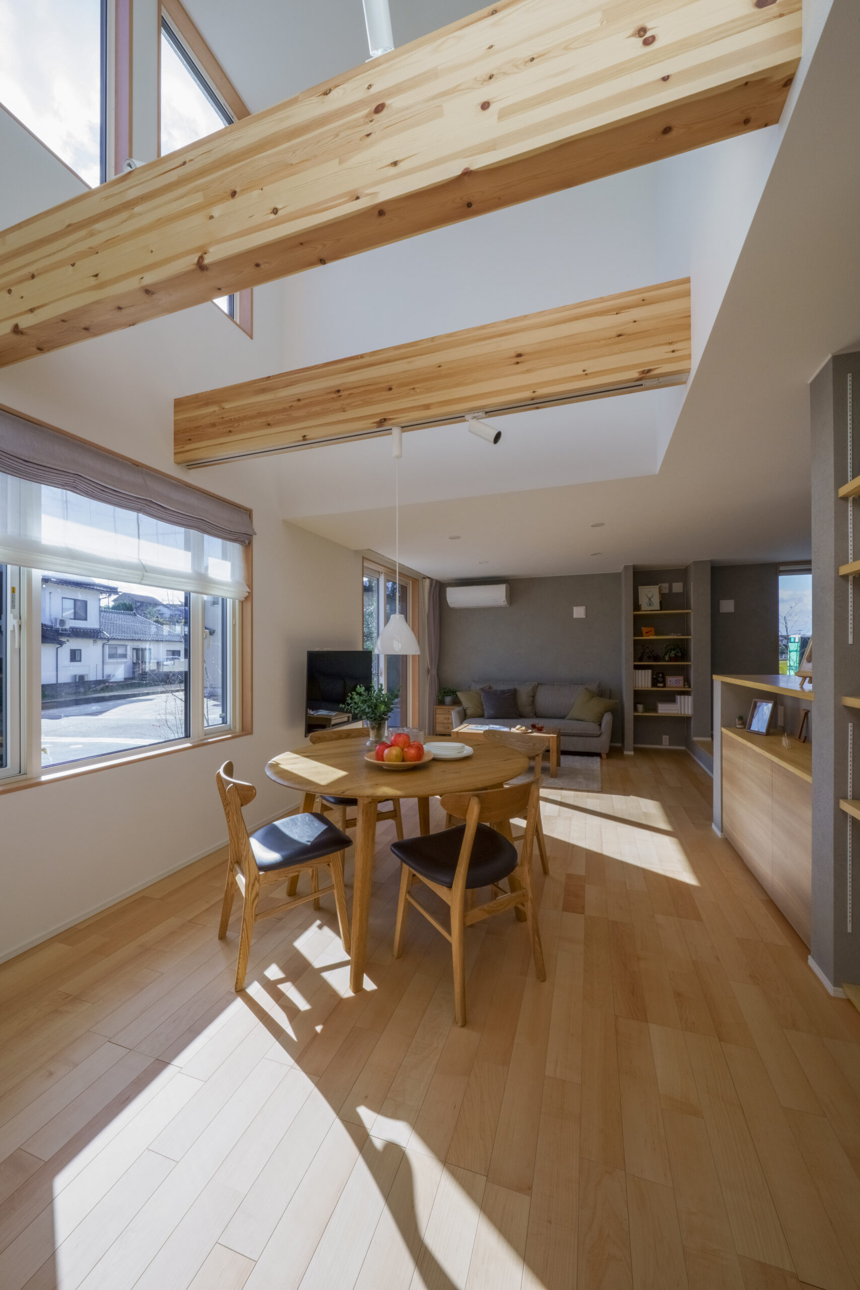 ダイニングに入ると、大きな吹抜けと南側に面し高窓から差し込む自然光でぱっと明るく心休まる空間は、自然と家族が集まる憩いの場として活躍してくれます。