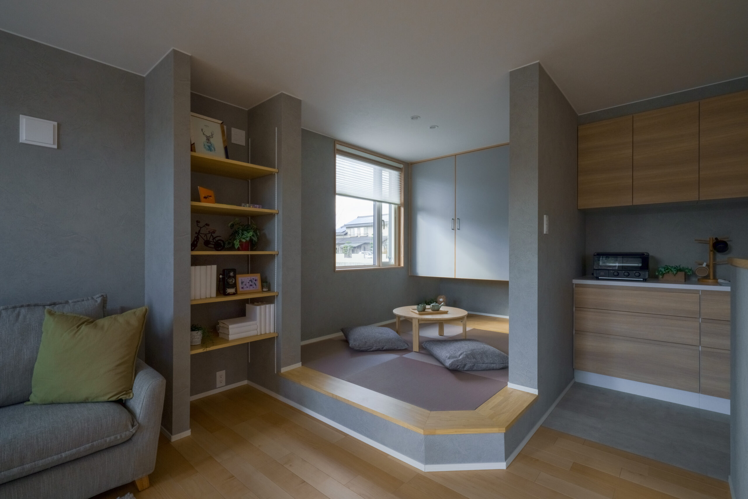 柔らかいグリーンの外壁・特徴的な三角屋根と銀黒の瓦で、可愛いらしくも引き締まった雰囲気の外観は、周りの景色に馴染みつつ、明るく優しい印象を与えてくれます。ダイニングにある大きな吹抜けと、暮らしやすいストレスフリーの動線で、居心地よく住みやすい和モダンな平屋風2階建てに仕上げました。