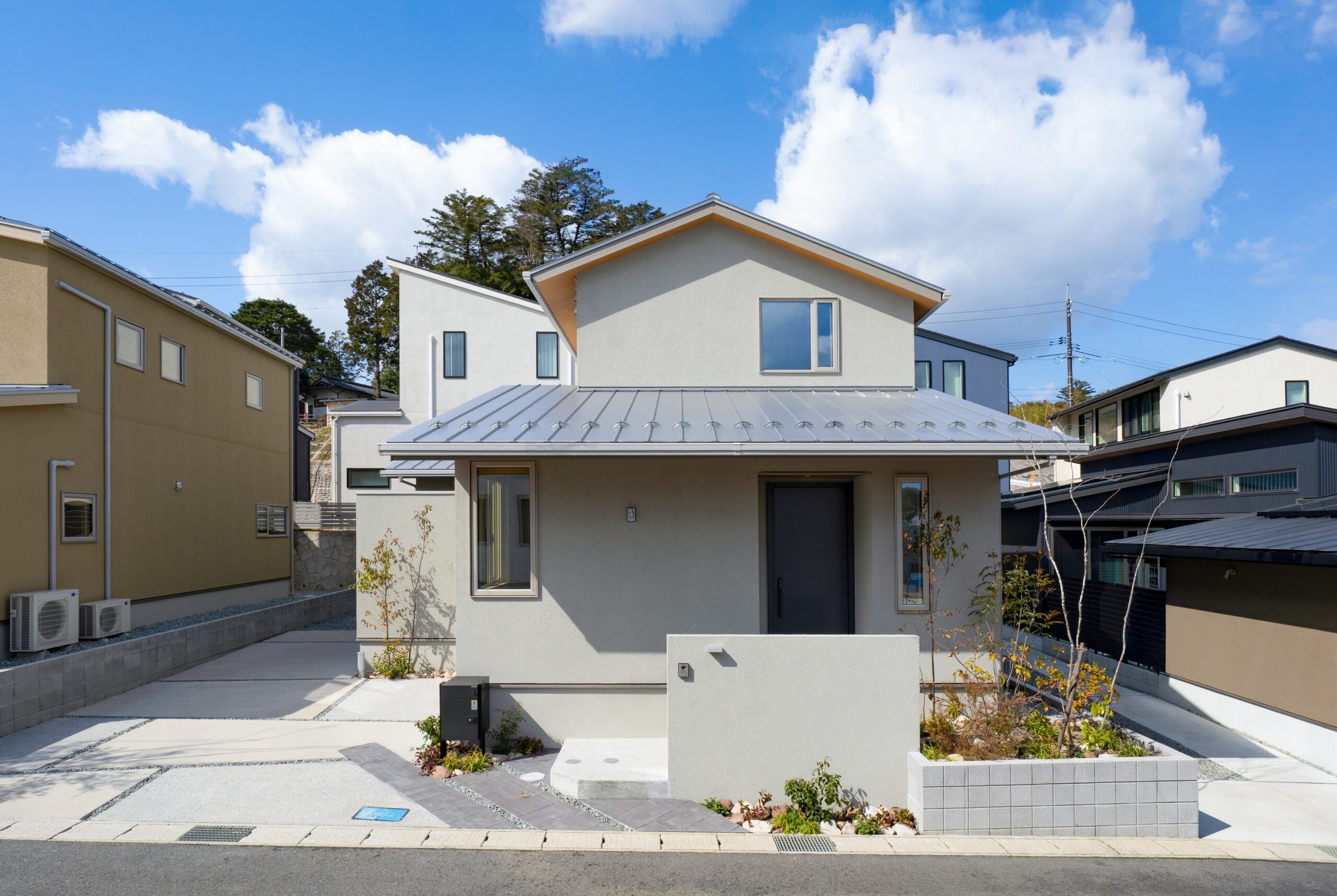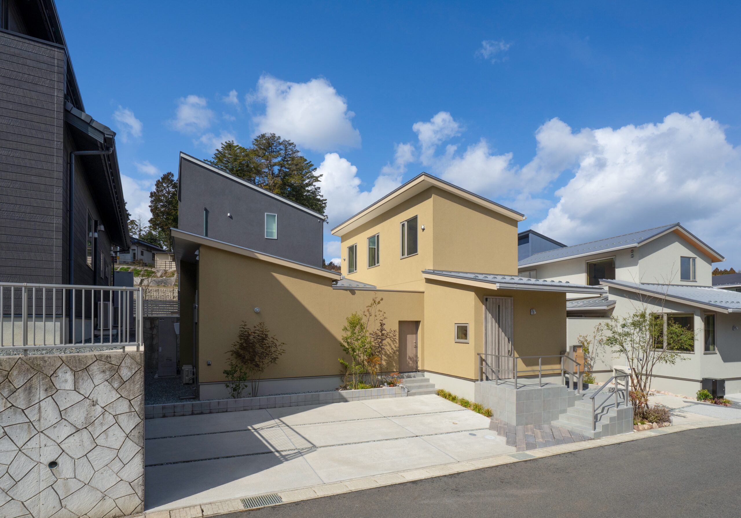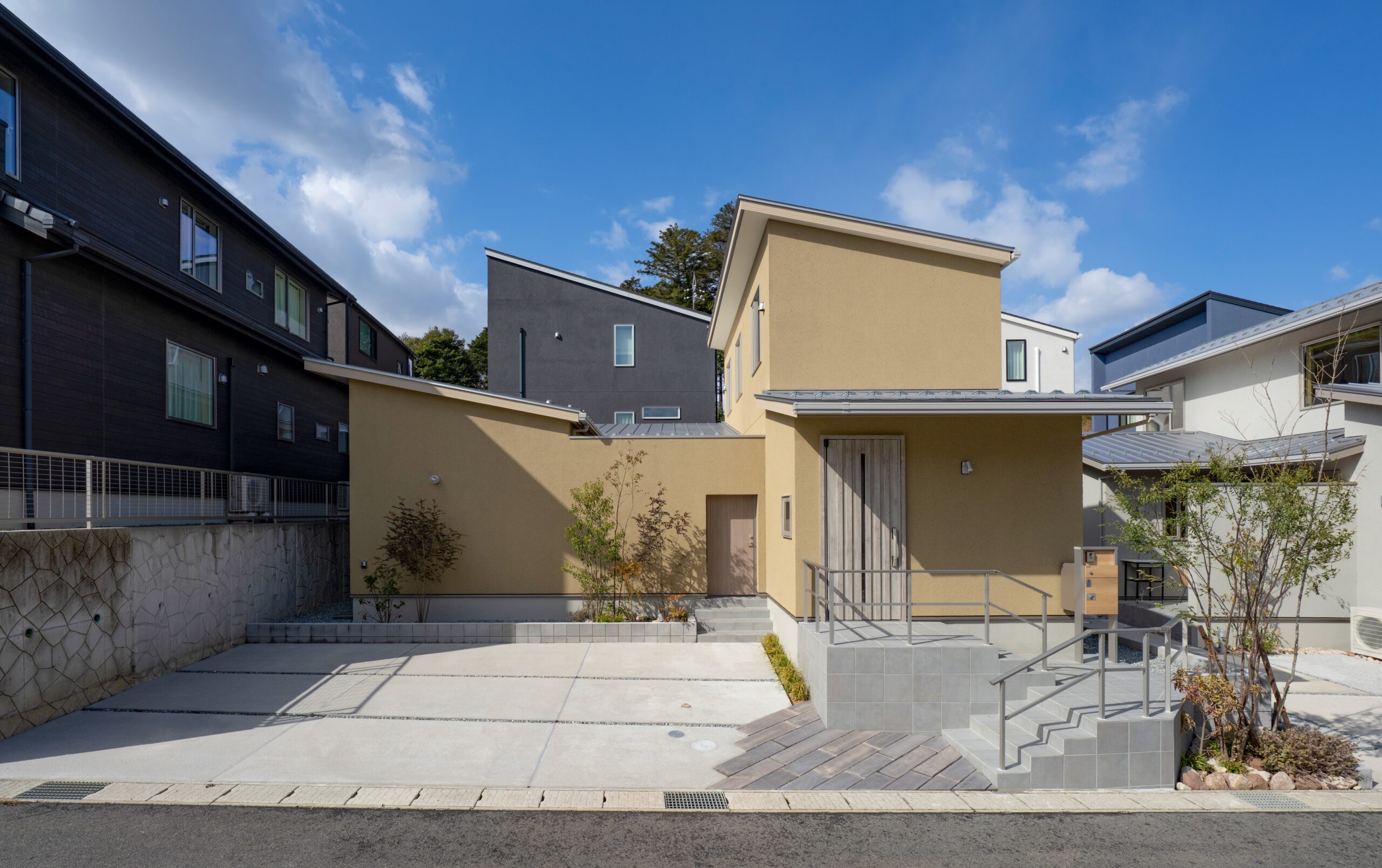 温かみのあるベージュカラーの外壁に、段違いの片流れ屋根を組み合わせたモダンなデザインの平屋風2階建て。シンプルでありながら個性を感じさせる外観は、街並みに自然に溶け込みつつ上品な印象を与えます。タイルテラスを囲むコの字型の間取りで、室内のすみずみにまで光が届き、明るく開放感にあふれた空間をつくり出します。