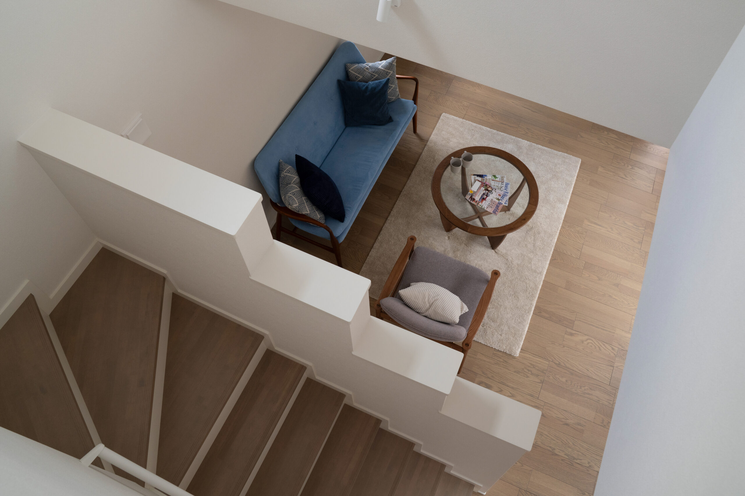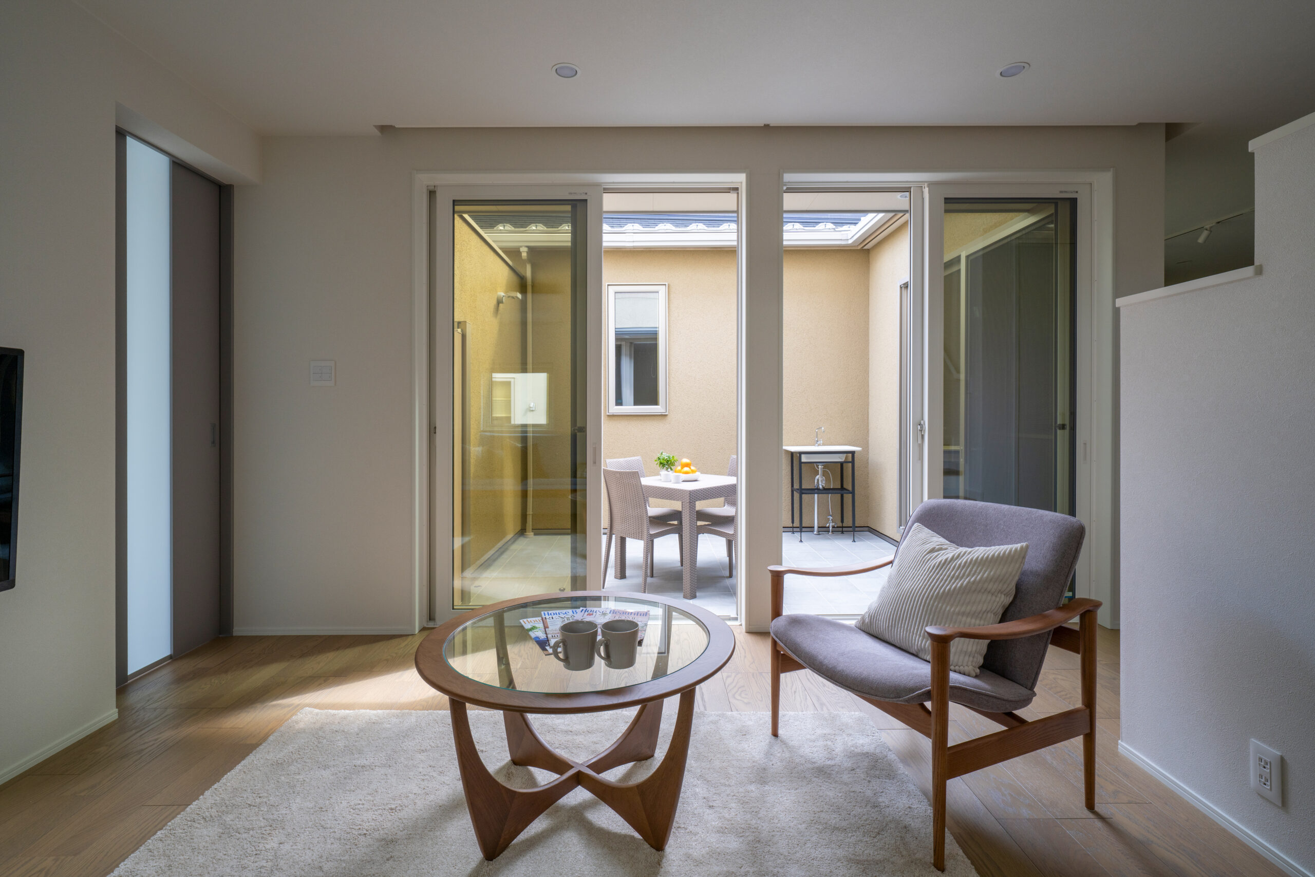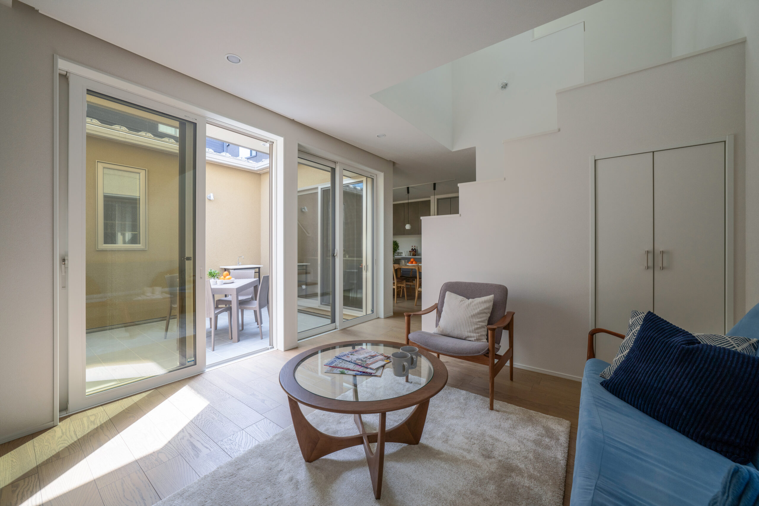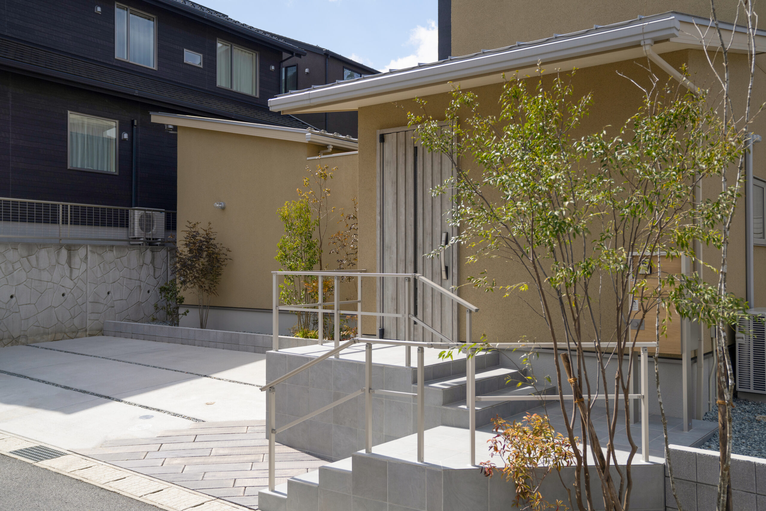 温かみのあるベージュカラーの外壁に、段違いの片流れ屋根を組み合わせたモダンなデザインの平屋風2階建て。シンプルでありながら個性を感じさせる外観は、街並みに自然に溶け込みつつ上品な印象を与えます。タイルテラスを囲むコの字型の間取りで、室内のすみずみにまで光が届き、明るく開放感にあふれた空間をつくり出します。