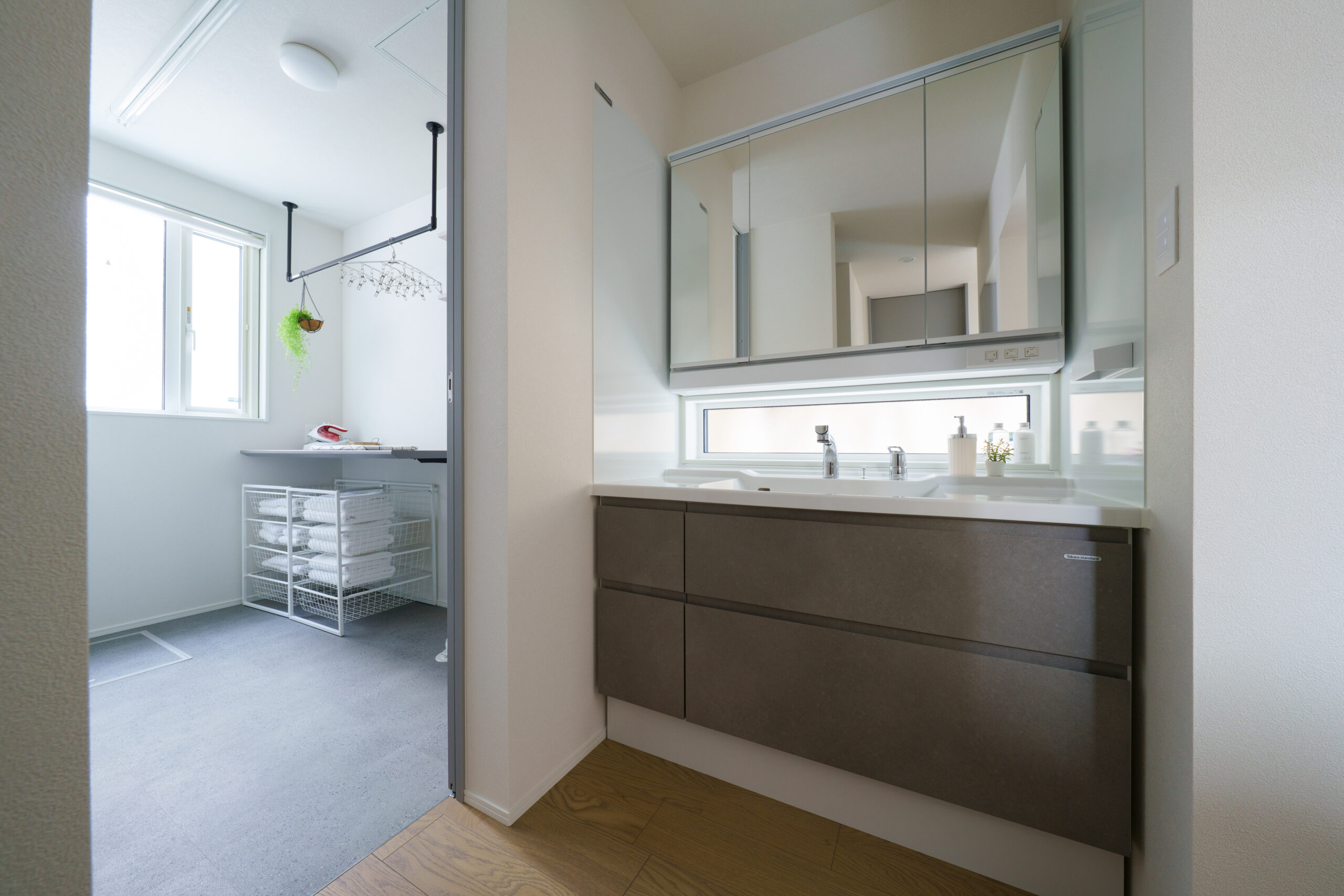 リビングまわりには収納スペースが充実しており、日々の小物や生活用品が散らかることなく、常にすっきりとした空間を維持することができます。また、水まわりが一直線に配置されているため、キッチンから洗面、ランドリーまでの動きがスムーズで家事の負担を軽減。さらに、寝室からトイレや洗面へのアクセスも良く、将来にわたって快適に暮らせる設計となっています。機能性と快適さを両立した、家族みんなに優しい住まいです。