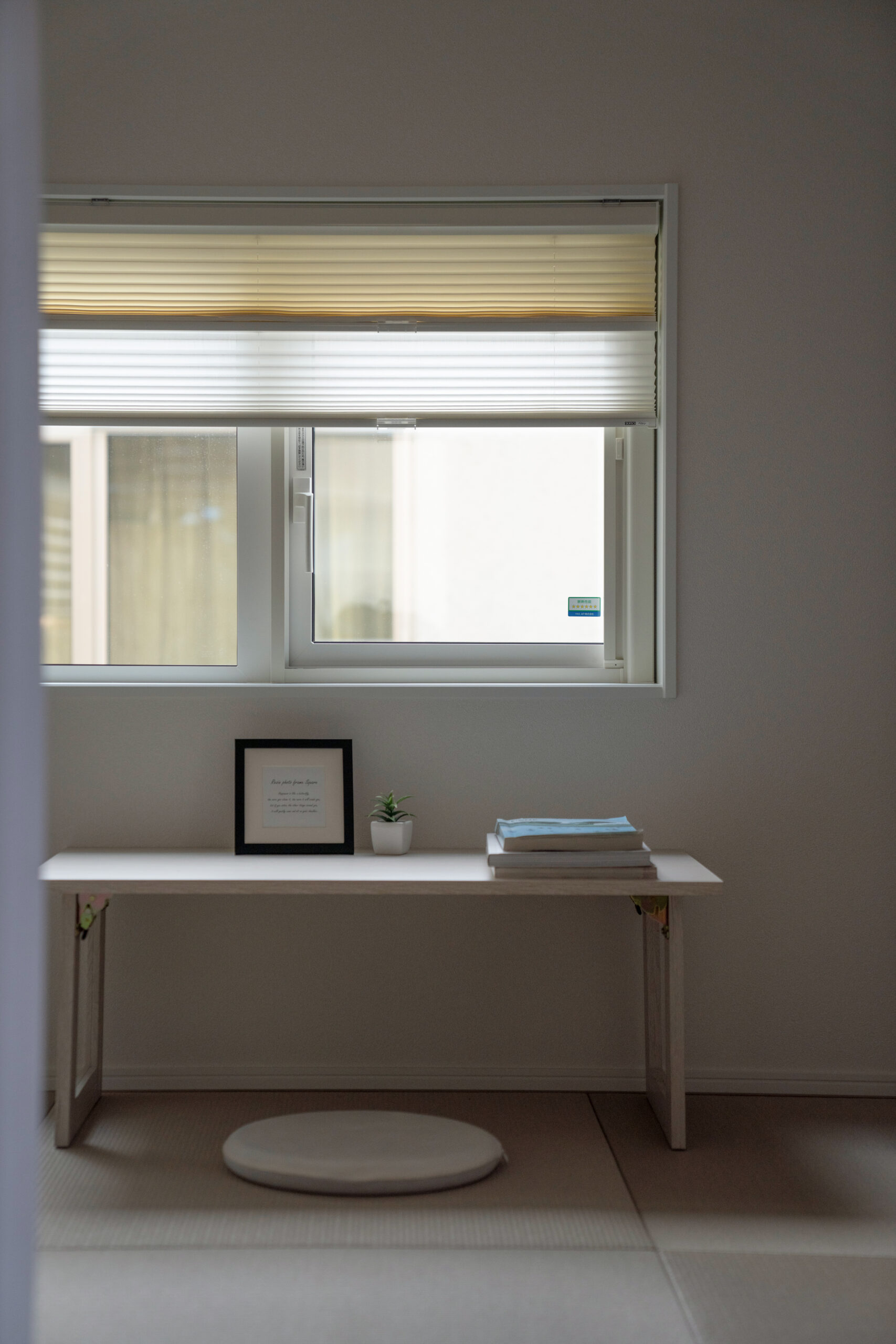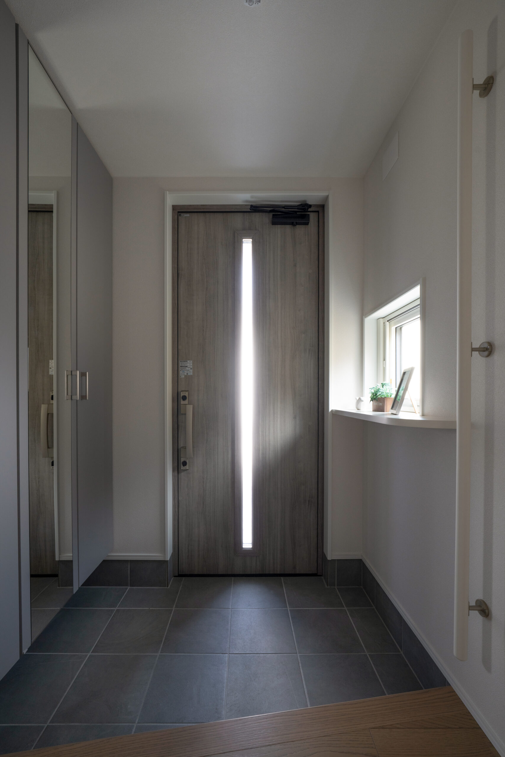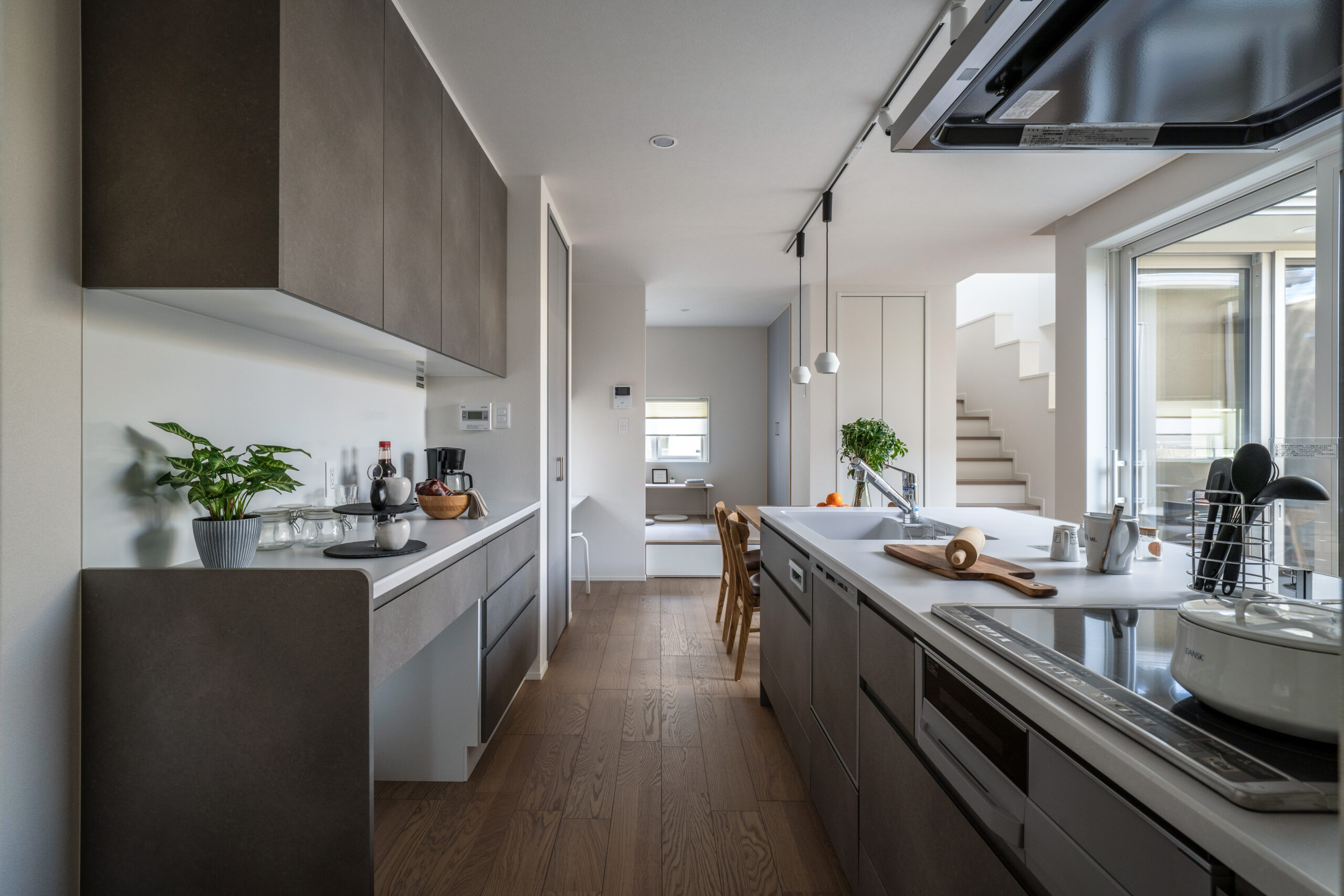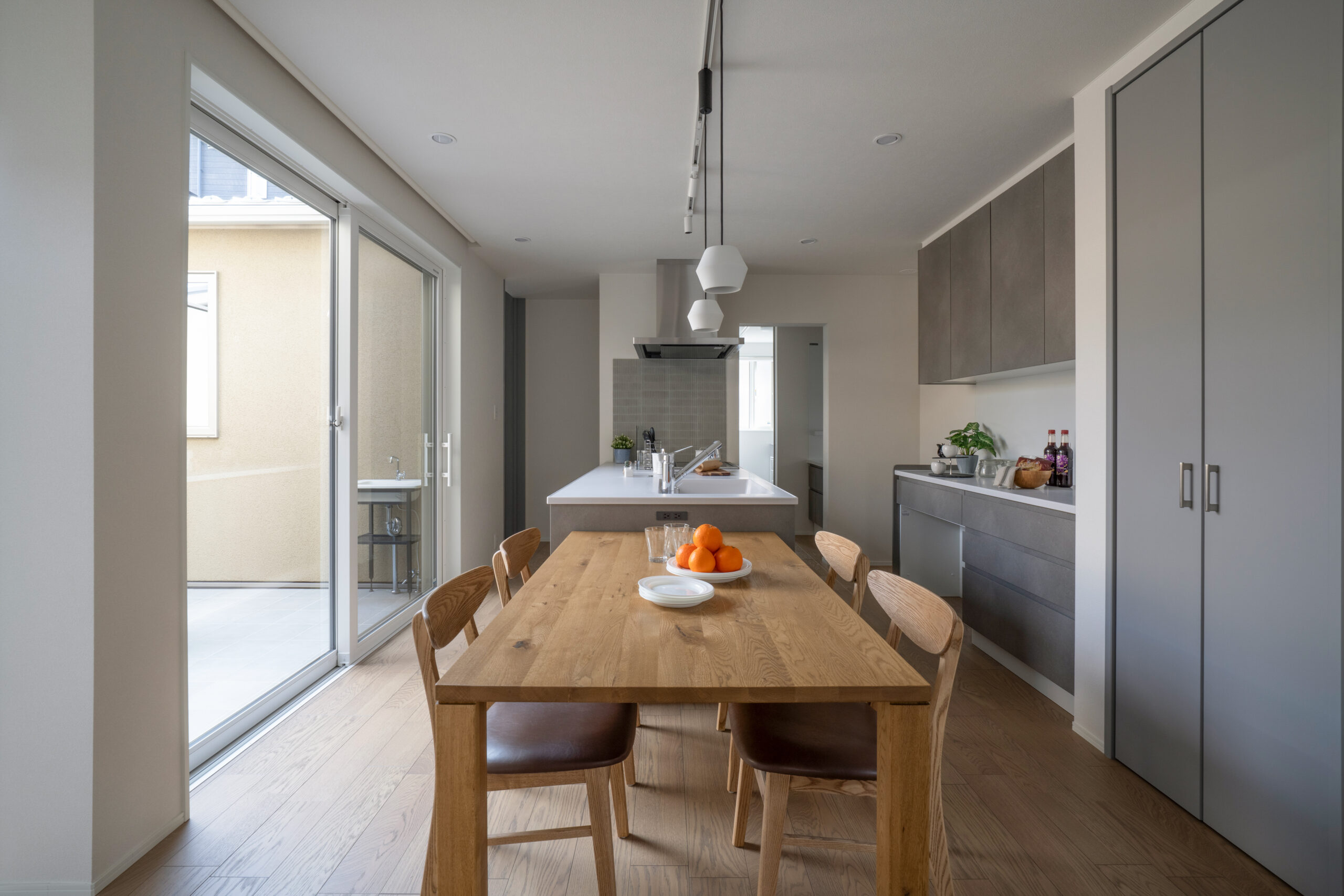 温かなベージュカラーの外壁が街並みにやさしく溶け込み、ナチュラルな印象を与える外観。そこにシャープな片流れ屋根を組み合わせることで、シンプルでありながら洗練されたモダンな美しさを感じさせる住まいに仕上がりました。家の中心にはタイルテラスを配置し、どこにいても外とのつながりを感じられる設計に。周囲の視線を気にすることなく、プライベートな時間をゆったりと楽しめる場所です。晴れた日にはテラスで朝のコーヒーを味わったり、週末には家族でBBQやお子さまのプール遊びをしたりと、気兼ねなく家族だけのひとときを満喫することができます。