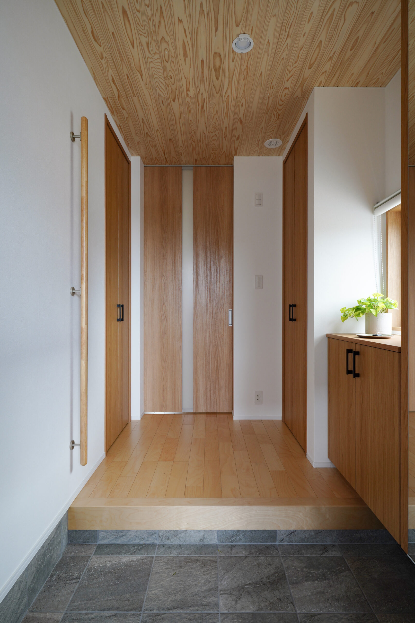 庭には季節の移ろいを楽しむ植栽が施され、緑に囲まれた穏やかな雰囲気を生み出しています。広々とした玄関ポーチは深い軒に守られ、雨の日でも安心感があります。板貼りの軒天が和モダンな印象を与え、訪れる人々を温かく迎え入れます。