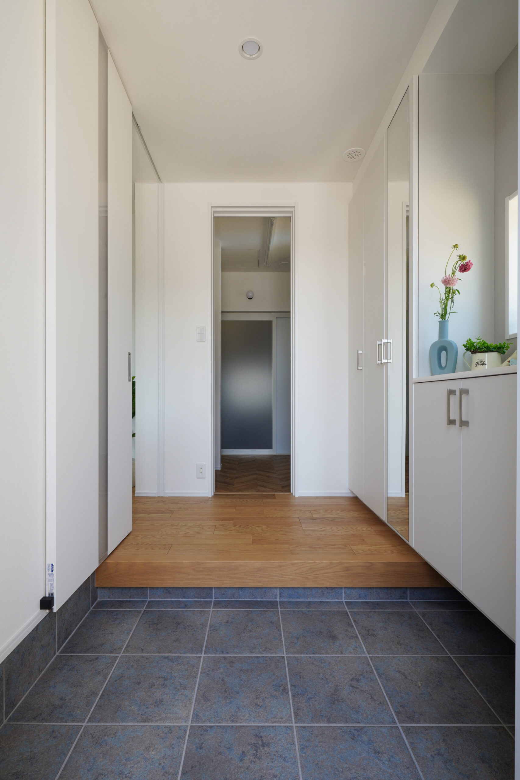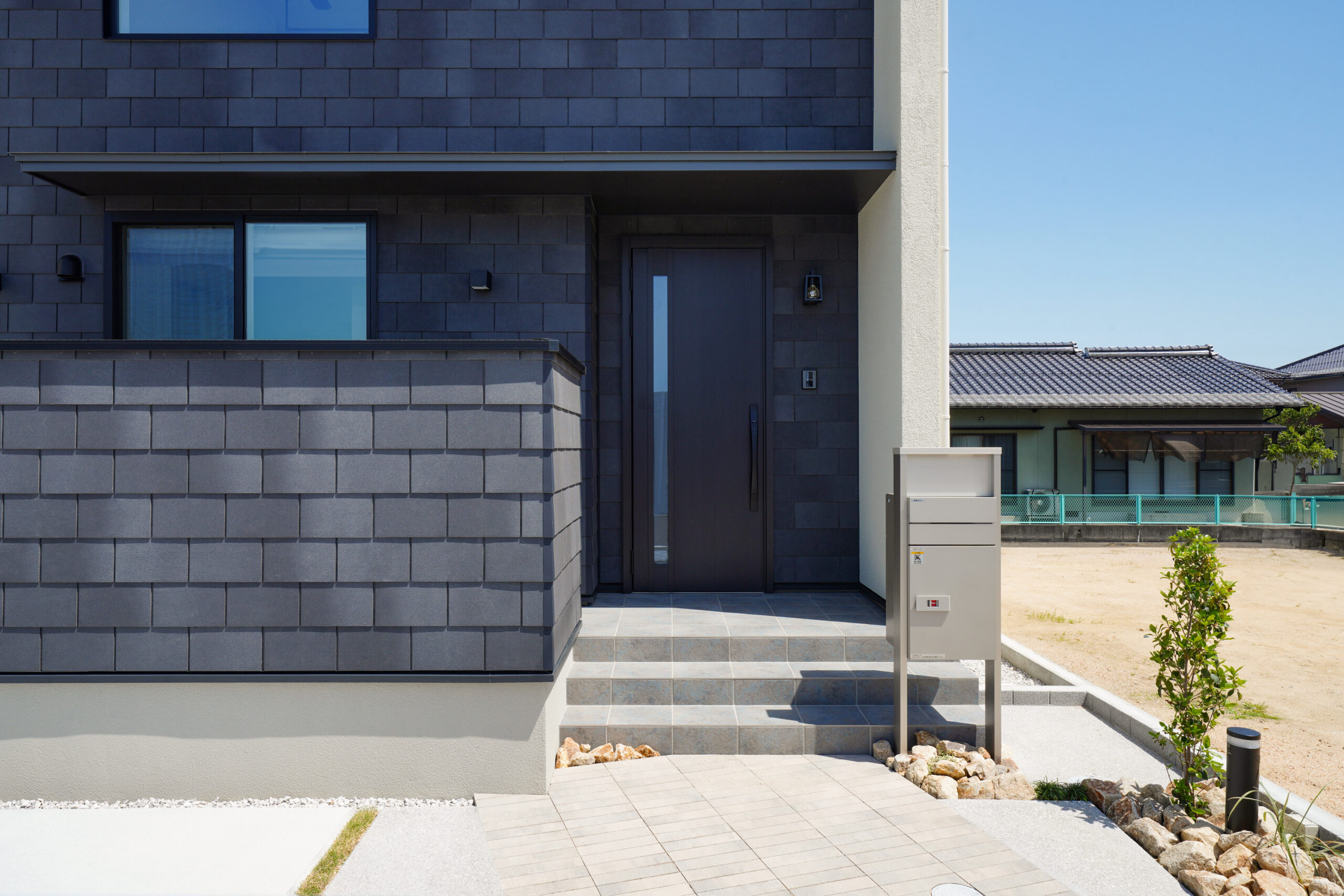 屋根はシックなカラー、外壁はレンガ調でモダンな外装を取り入れました。タイルテラスは、外壁と同じデザインで腰壁を設けた事で、外観の統一とプライバシーに配慮した造りとなっております。